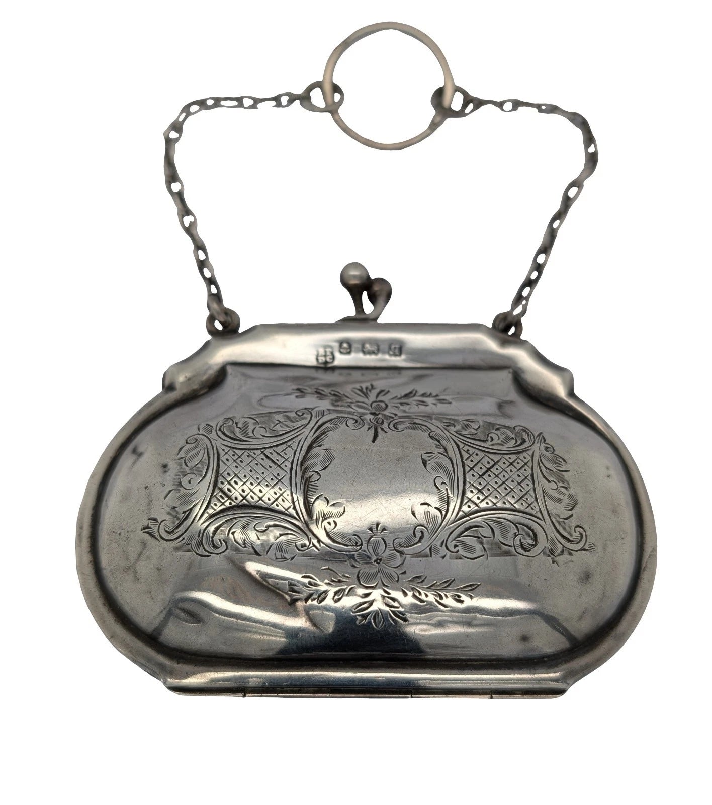 Attached are two solid silver chains leading to a large finger ring, a classic and practical design from the period that allowed the purse to be carried securely while shopping. Both stylish and functional, this is a charming piece of Edwardian-era design.