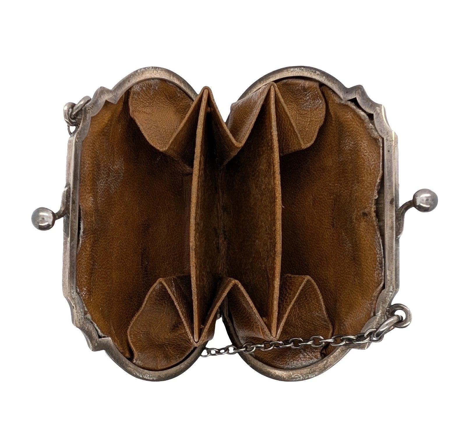 The purse features an elegant oval solid silver body and retains its original leather interior, which is divided into three separate compartments, ideal for coins or small keepsakes. It closes securely with a snap clasp, which functions as it should.