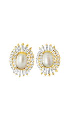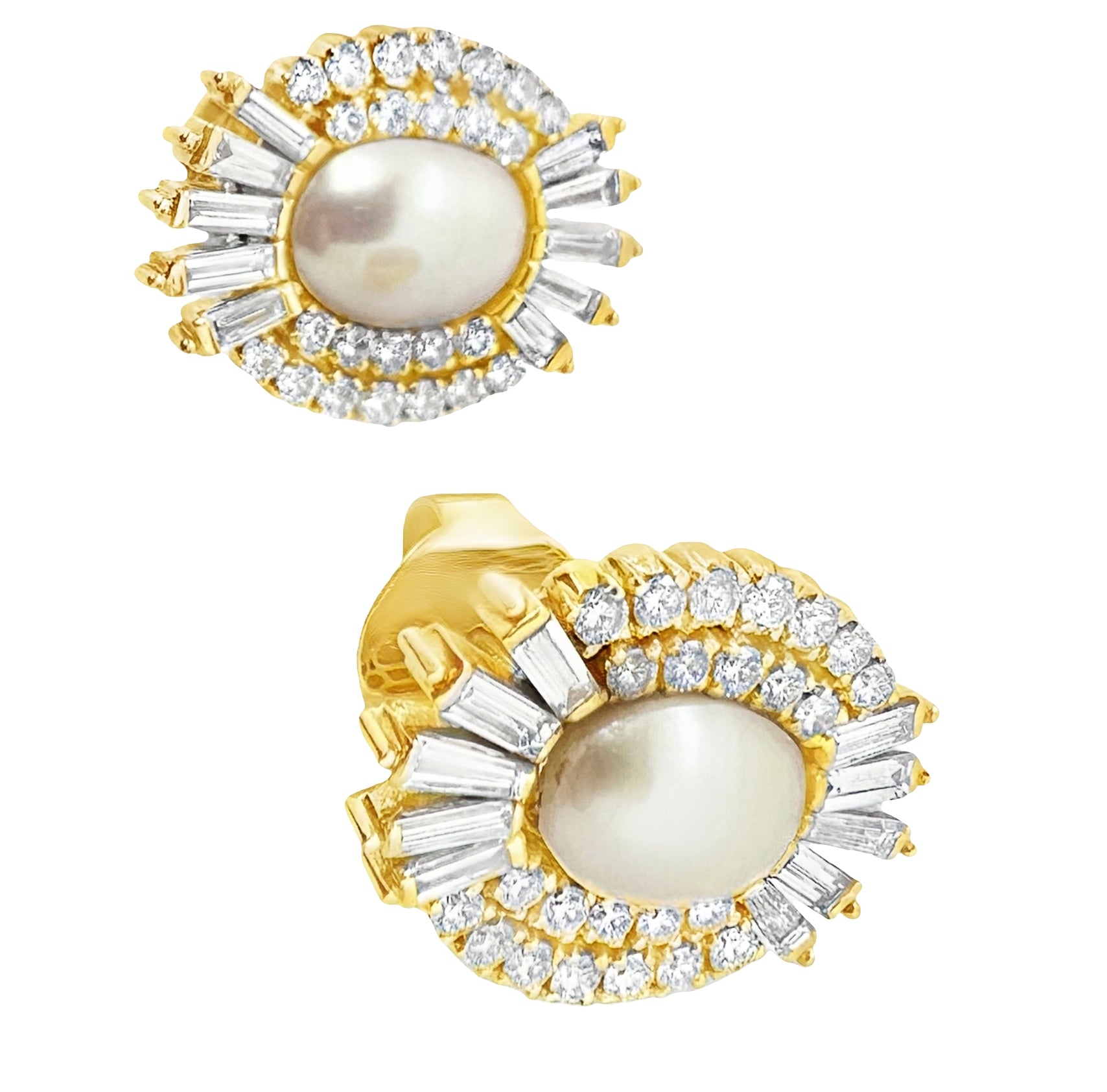 Each earring features a luminous oval pearl at its centre, beautifully framed by a halo of sparkling brilliant-cut diamonds. Baguette-cut diamonds fan out above and below the pearl, creating a radiant sunburst effect that adds depth, movement, and refined glamour. Crafted in rich 18ct yellow gold, these studs offer exceptional brilliance and enduring sophistication.
