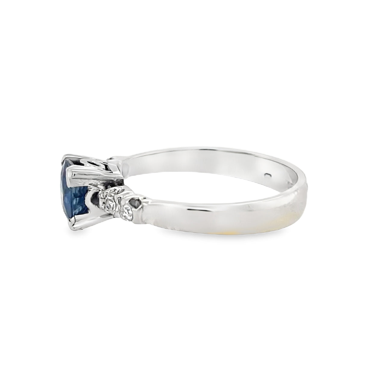 Flanking the central sapphire are two exquisite diamonds, each set in a secure claw setting, adding a touch of sparkle and sophistication. The diamonds contribute to a total diamond weight of 0.10ct, perfectly complementing the rich blue of the sapphire.