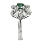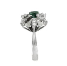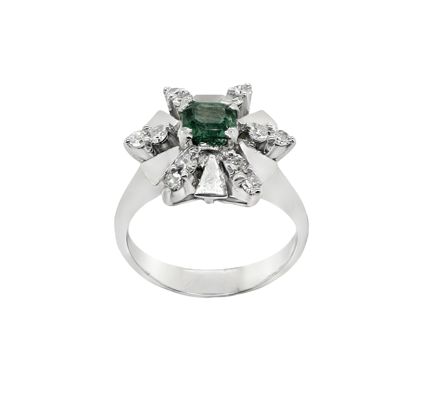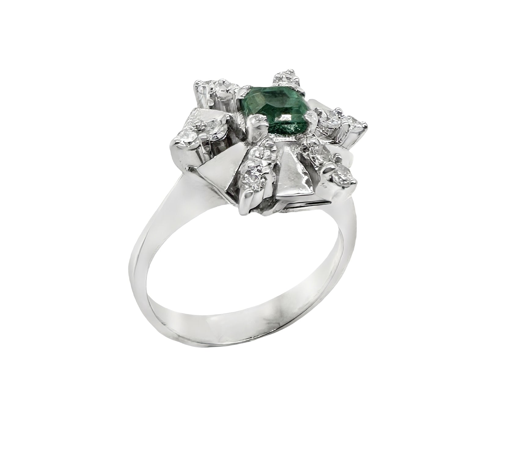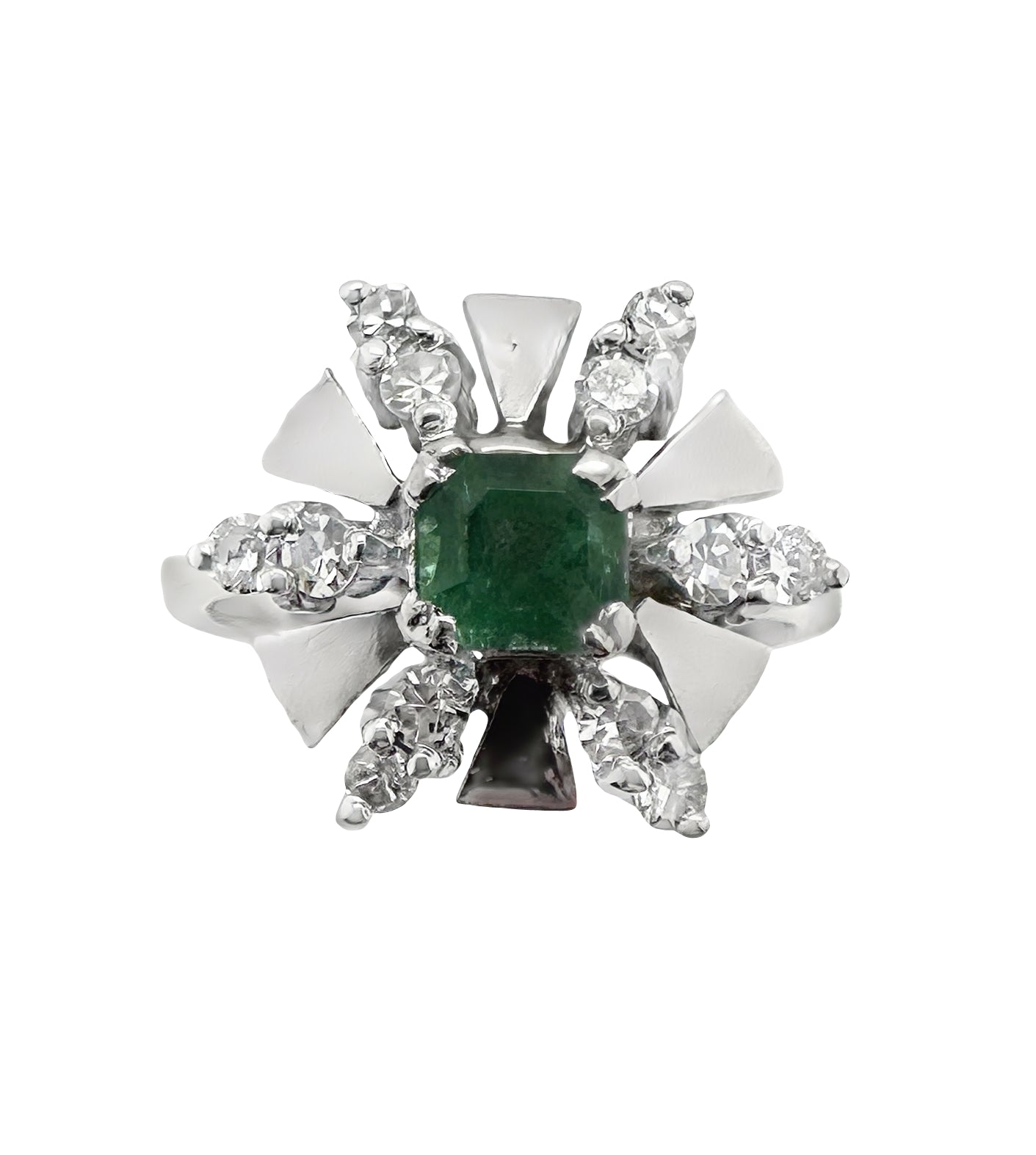 Six polished, tapered white gold sections complete the floral motif, adding depth and dimension to the design while reflecting light beautifully from every angle. The combination of vibrant emerald and glittering diamonds set in rich white gold results in a sophisticated and timeless piece of fine jewellery.