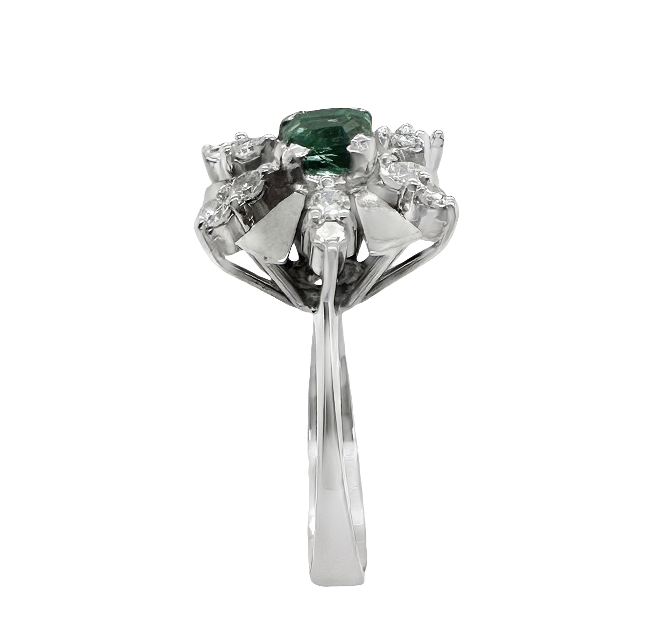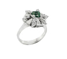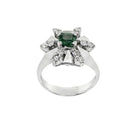 This exquisite 18ct white gold ring features a captivating floral design, centred around a vivid green emerald measuring approximately 3.7mm. Surrounding the emerald are six graceful rows, each set with two sparkling brilliant-cut diamonds (1/40 carat each), creating a beautiful petal-like formation that enhances the ring’s natural elegance.