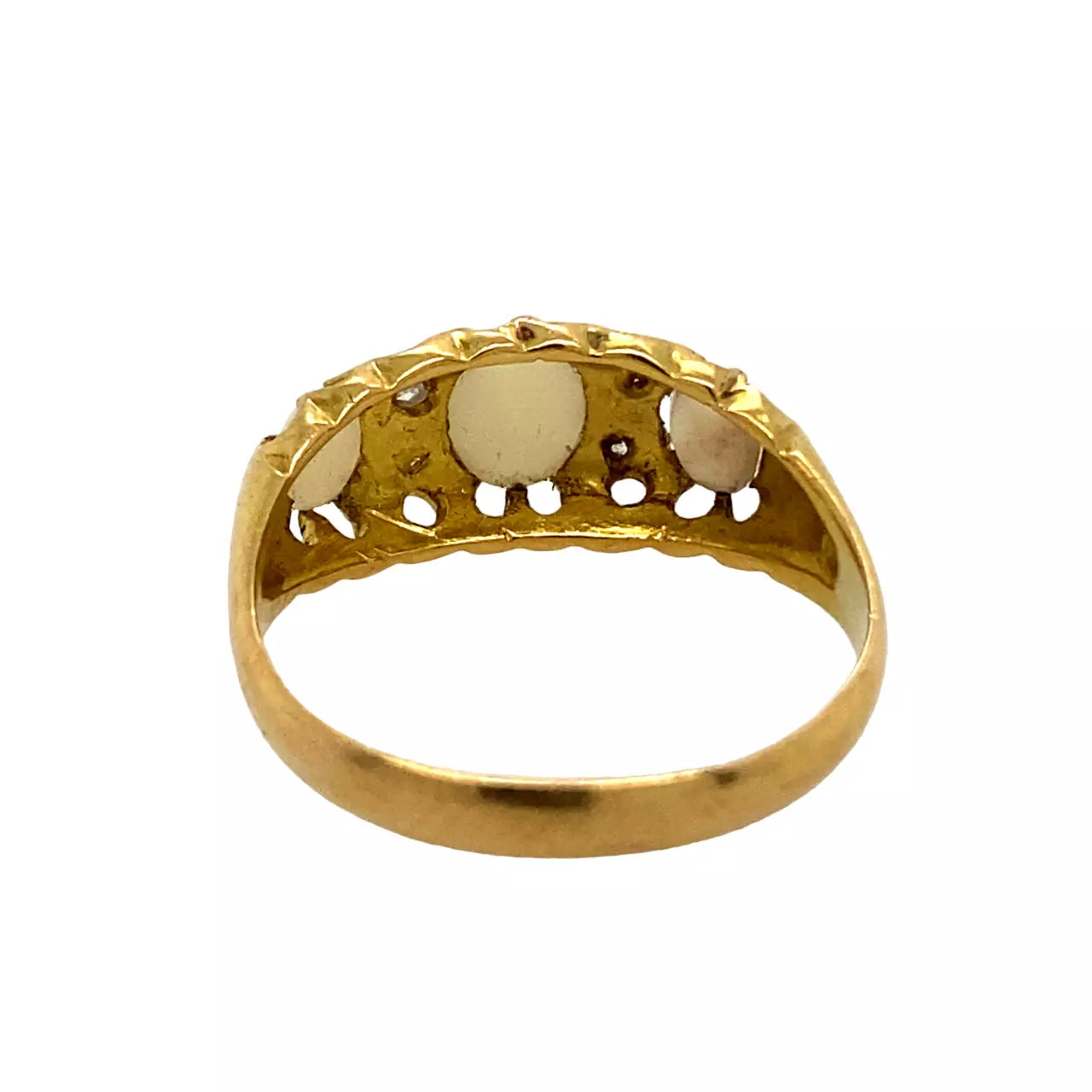 This wonderful antique ring, fully hallmarked by the Assay Office of Birmingham in 1863 for 18ct Gold features three Opals in a scroll style gallery, punctuated with four Diamonds to give the ring a sparkle alongside its opalescence. The center oval Opal measures 6.5 x 4.5mm with the side stones slightly smaller at 5 x 3.4mm. They are held together via a prong setting. The band tapers from 5mm to 2.5mm with a thickness of 1mm. A stunning ring that is nearly 160 years old.