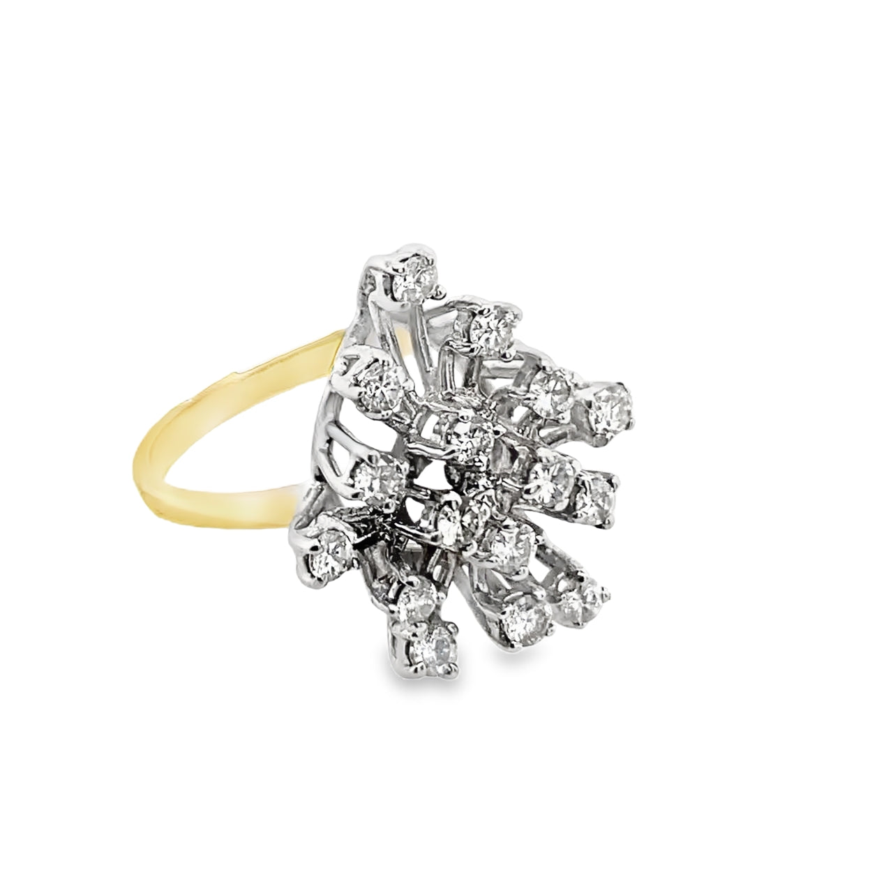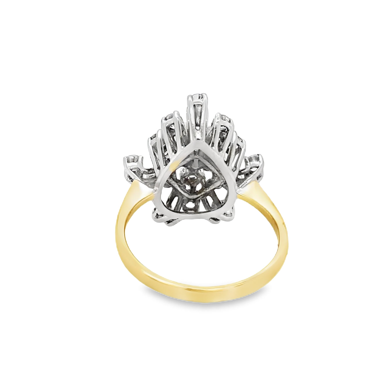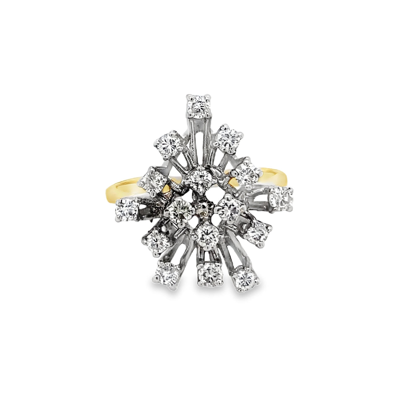 18ct yellow Gold fancy Diamond cluster ring with a total carat weight of approximately 0.8ct. The 3 tier ring consists of 16 brilliant cut white Diamonds all individually prong set with an open gallery. The stones are roughly 0.05ct each, totaling 0.8ct. The width of the yellow Gold band is 2mm.