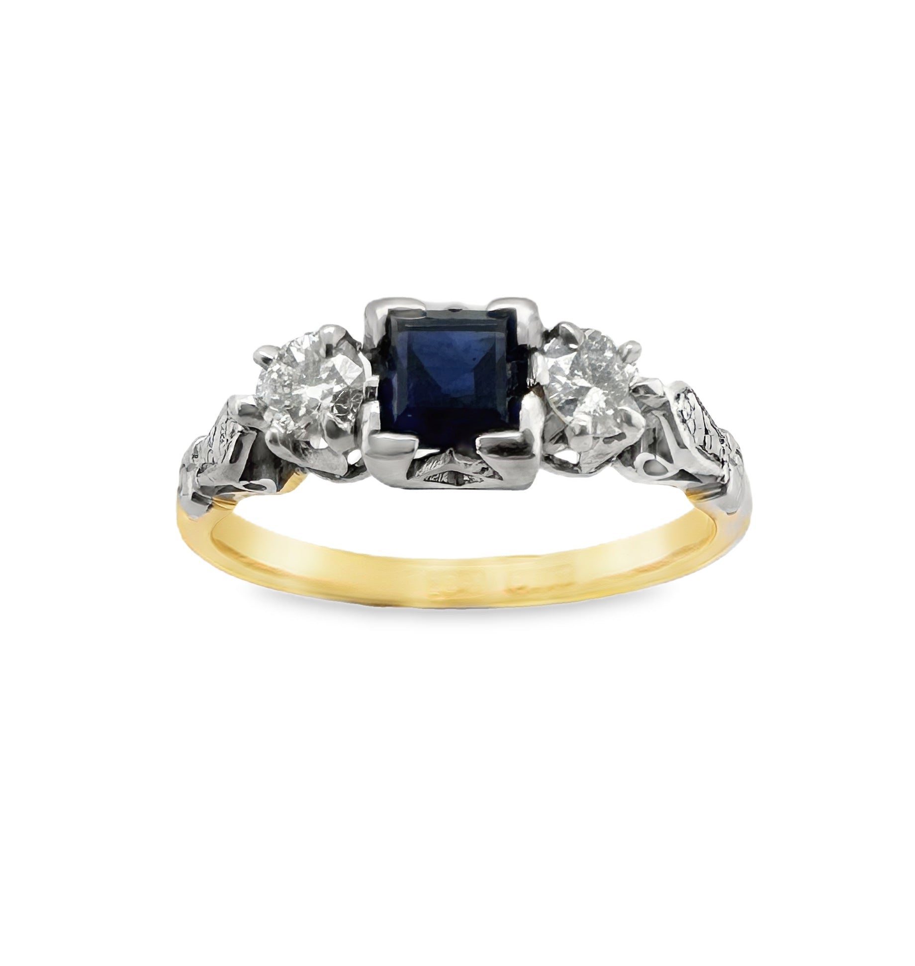 A beautiful example of classic craftsmanship, this 18ct yellow gold ring features a vibrant 3.0mm blue sapphire at its centre, elegantly accented by two sparkling diamonds, each weighing approximately 0.10 carats. The gemstones are set within a platinum head, enhancing their brilliance and adding a refined contrast to the warm tone of the yellow gold shank.