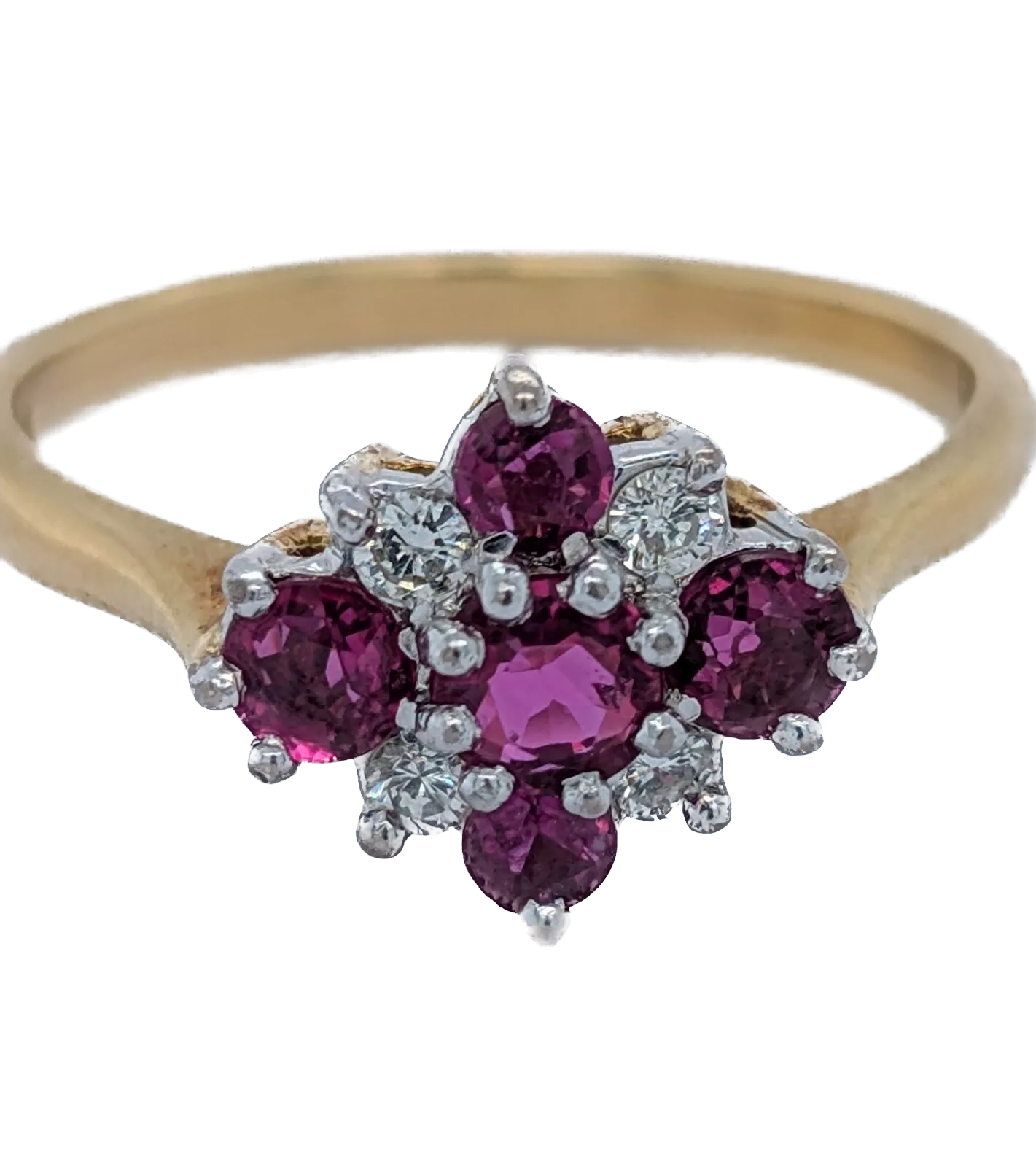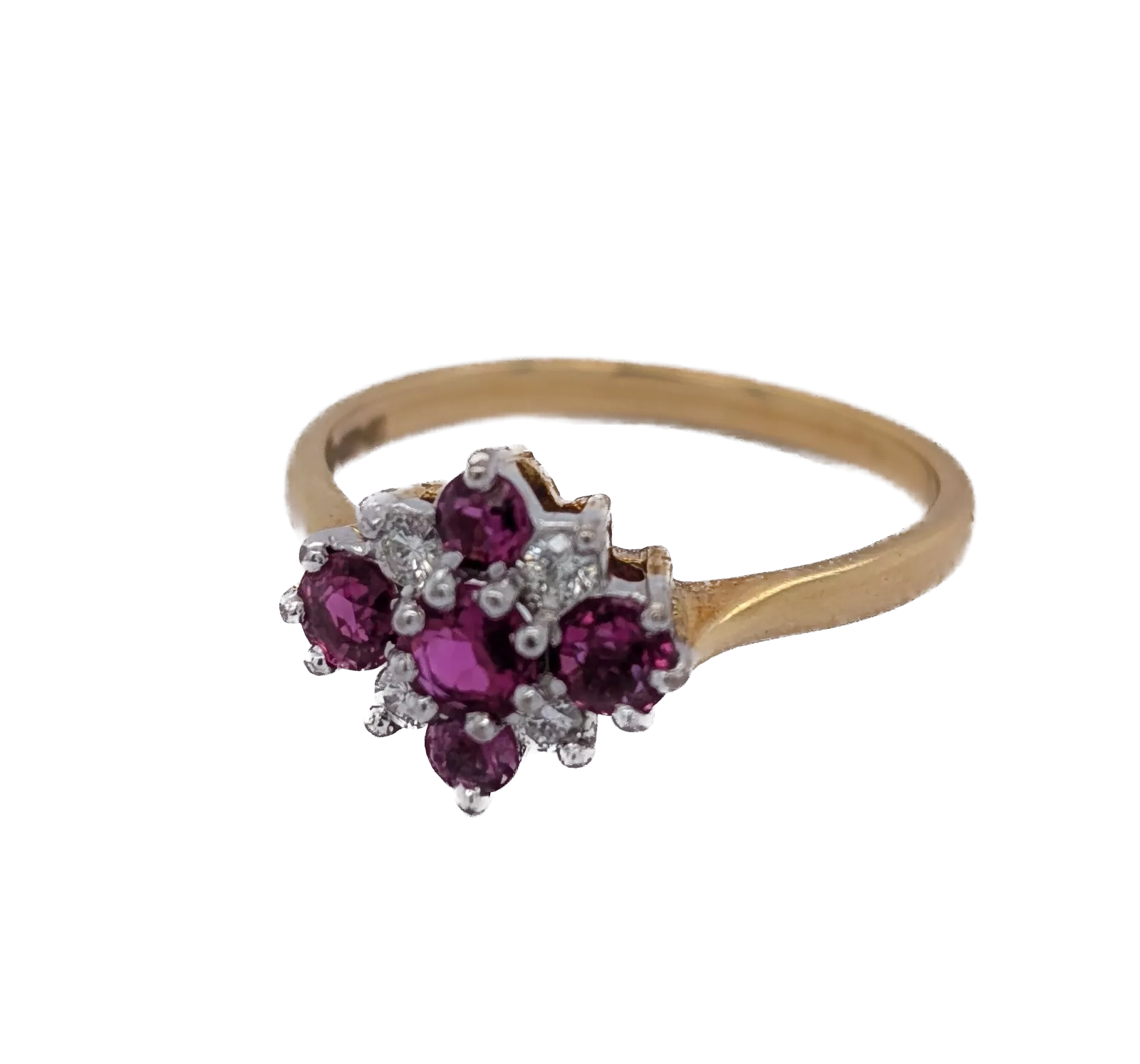 Indulge in timeless beauty with this exquisite ruby and diamond cluster ring, featuring five vibrant rubies and four dazzling diamonds set in an elegant design.