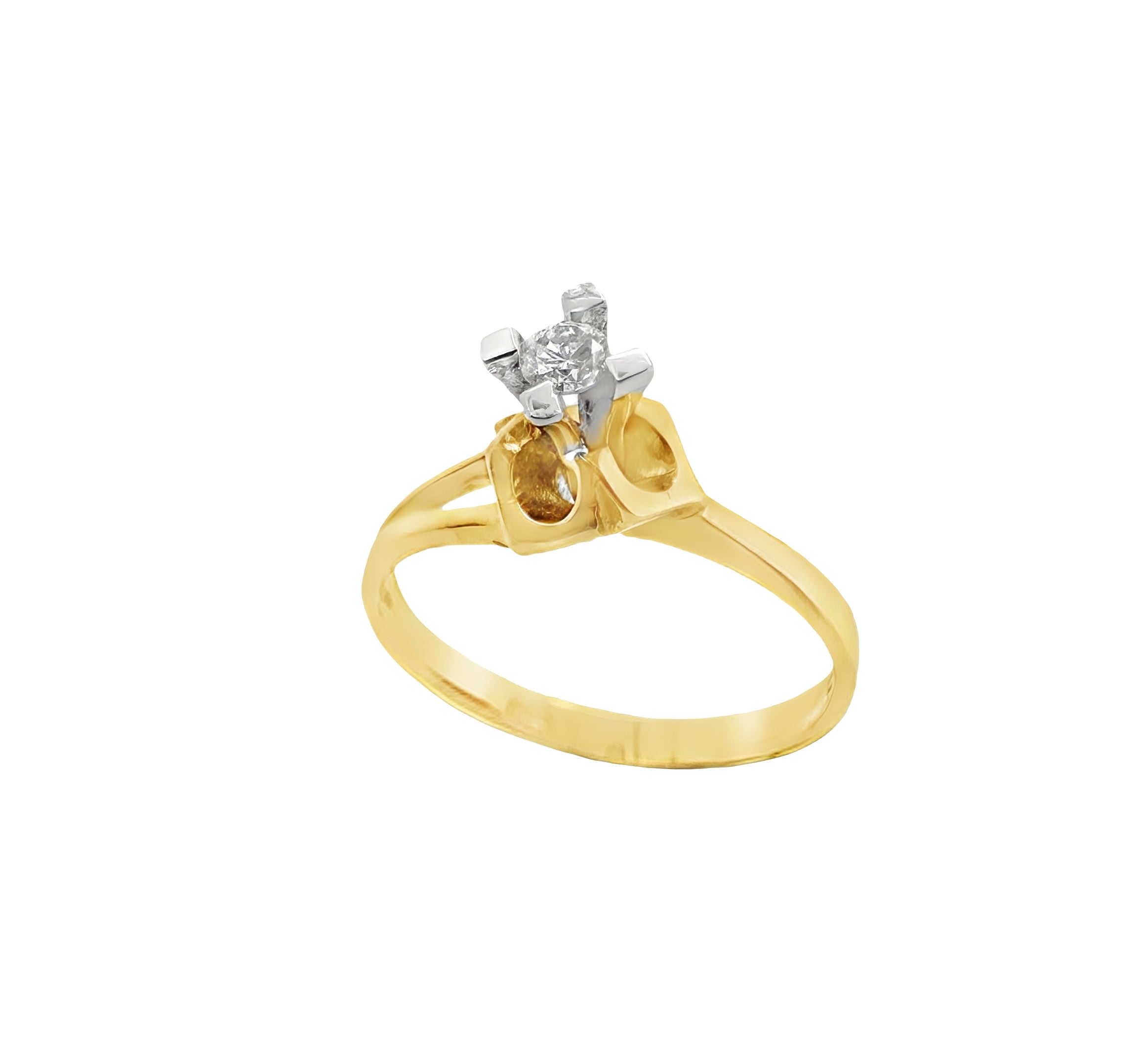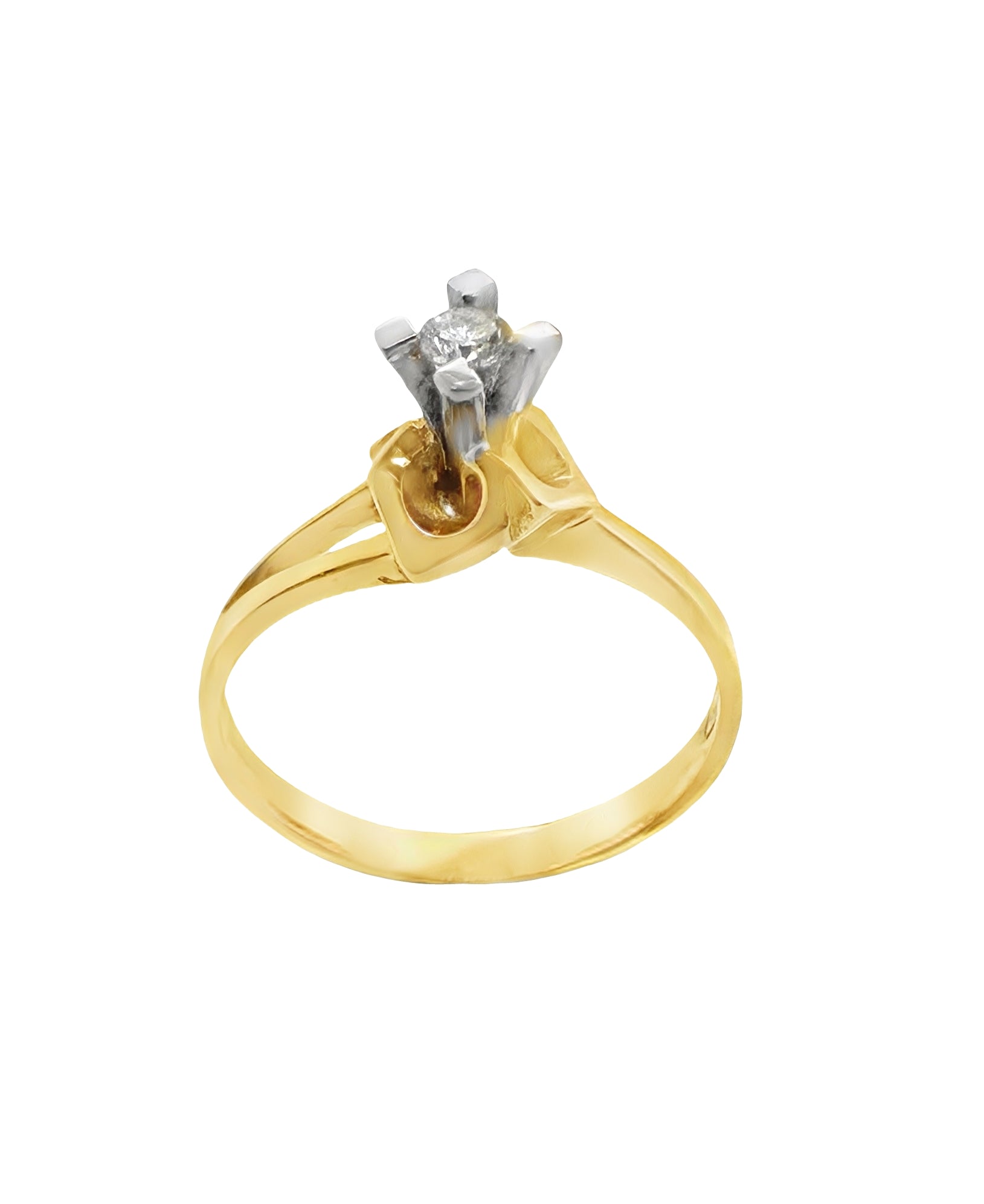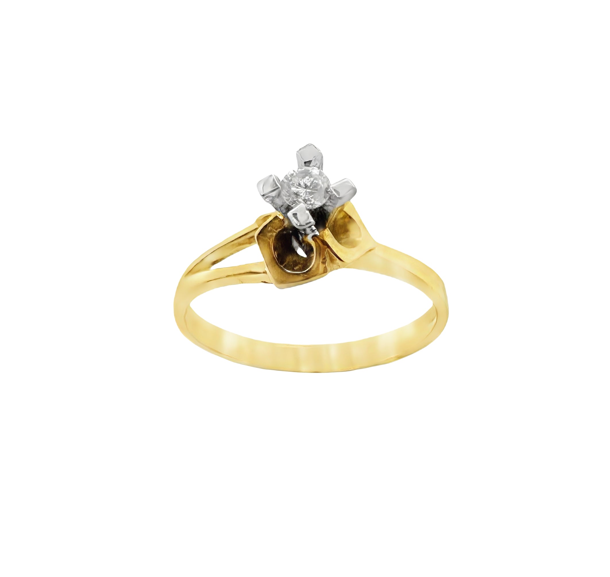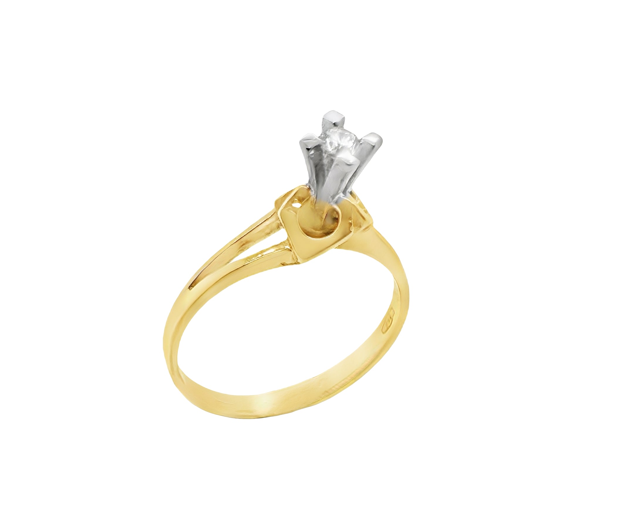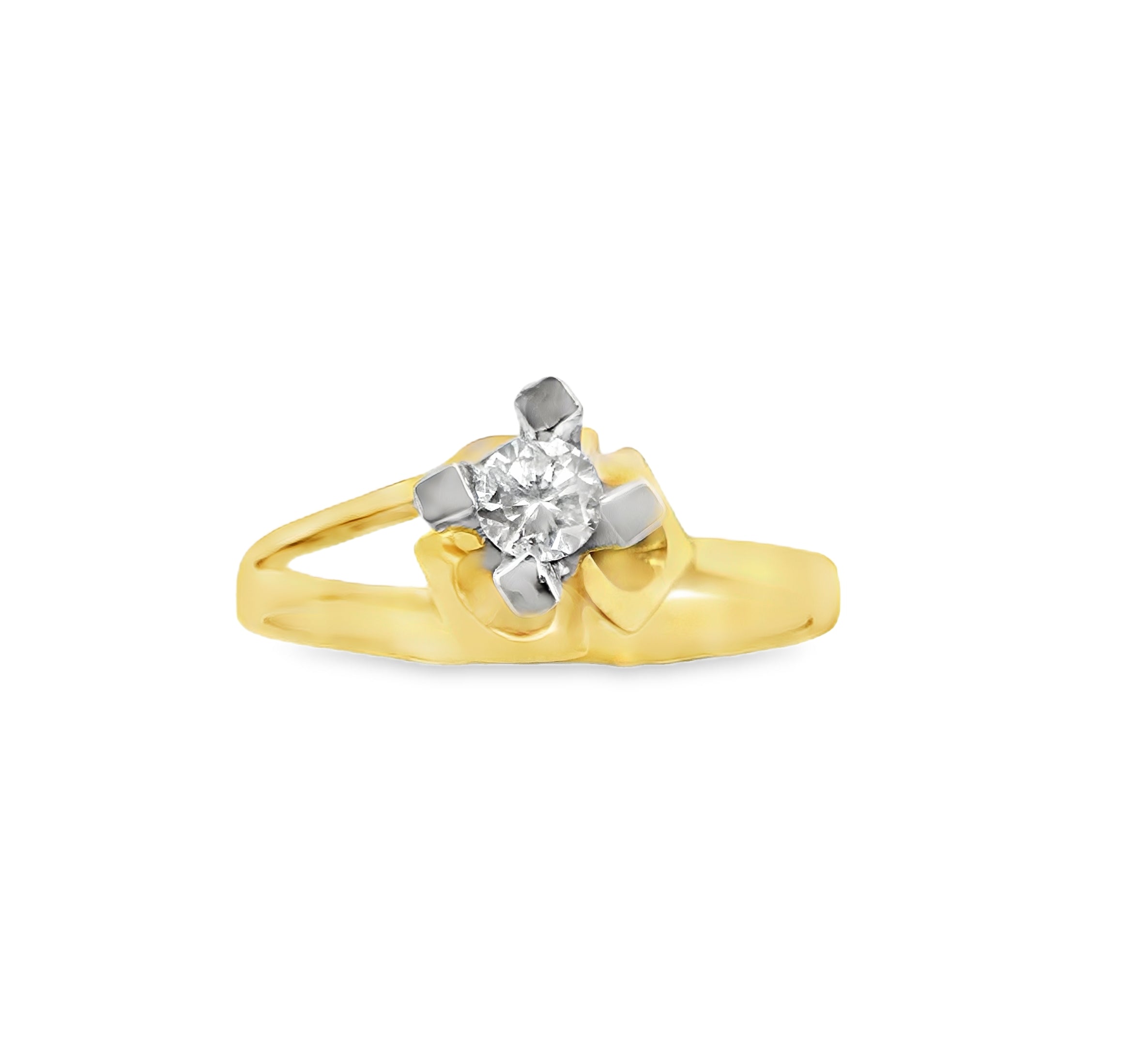 Refined and elegant, this 18ct yellow gold solitaire diamond ring features a delicate 0.05ct round brilliant-cut diamond, securely held in a high 4-claw white gold setting. The contrasting tones of yellow and white gold beautifully enhance the diamond’s natural brilliance, creating a timeless and versatile design.