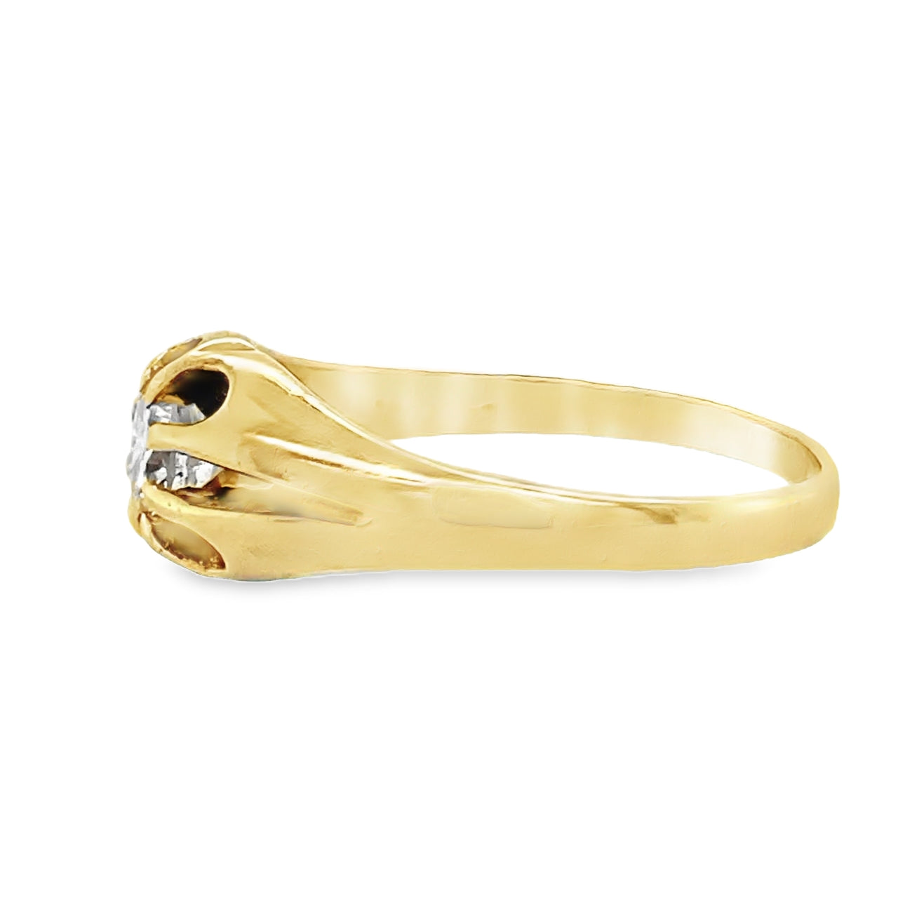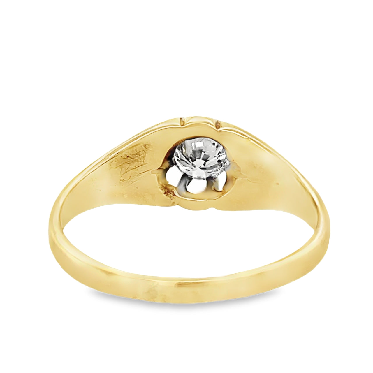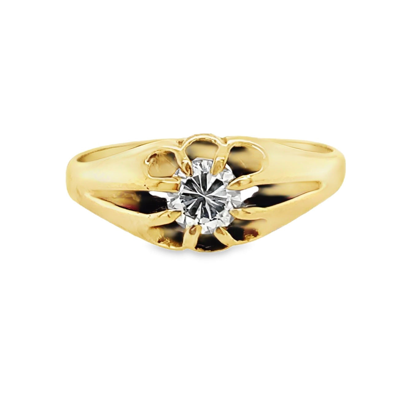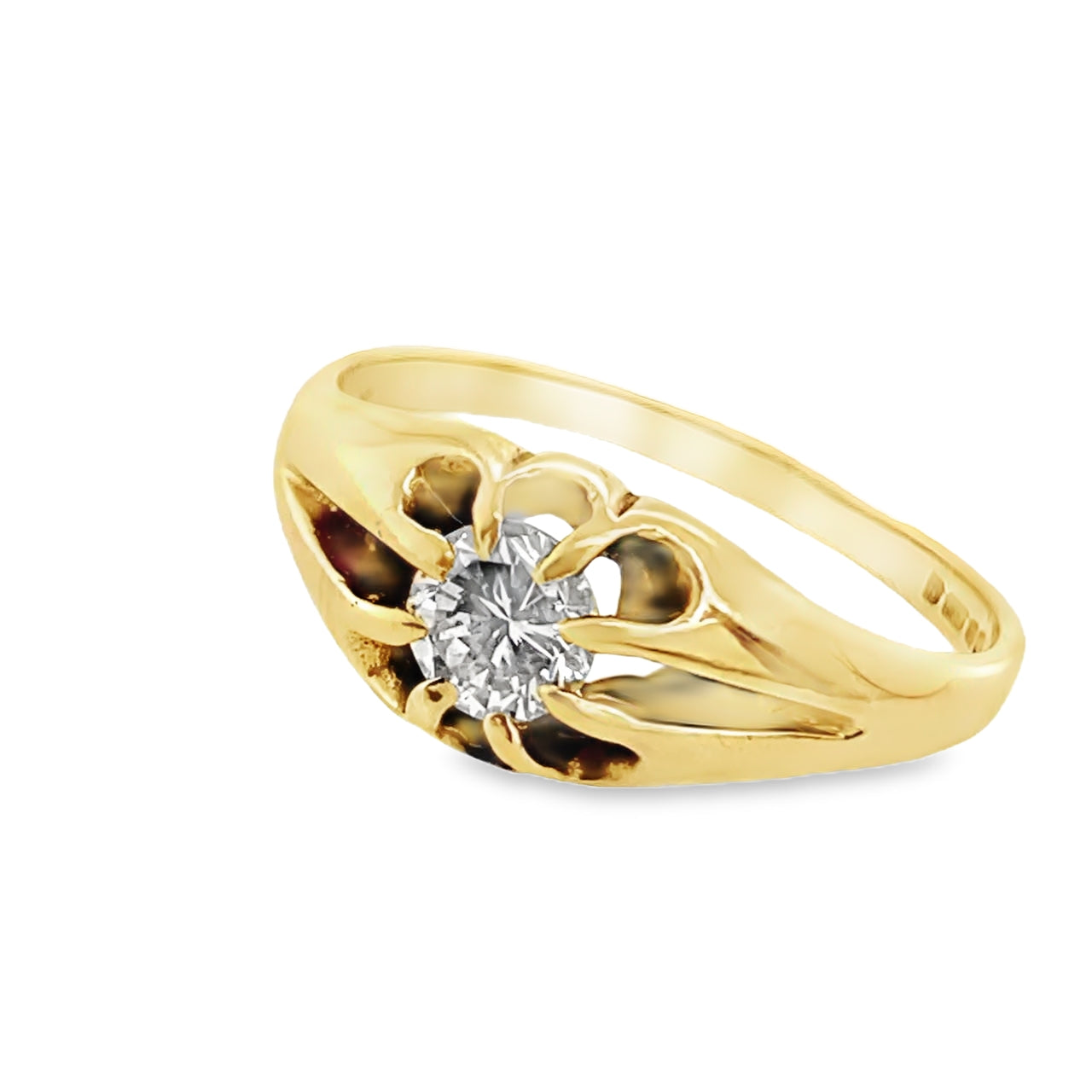 A lovely vintage 9ct yellow Gold Diamond gypsy set solitaire ring, fully marked for 9ct Gold. The ring is set with a beautiful sparkly white 0.15ct Diamond held together via an 8 claw setting. The width of the band tapers to 1.6mm with a thickness of 0.9mm.