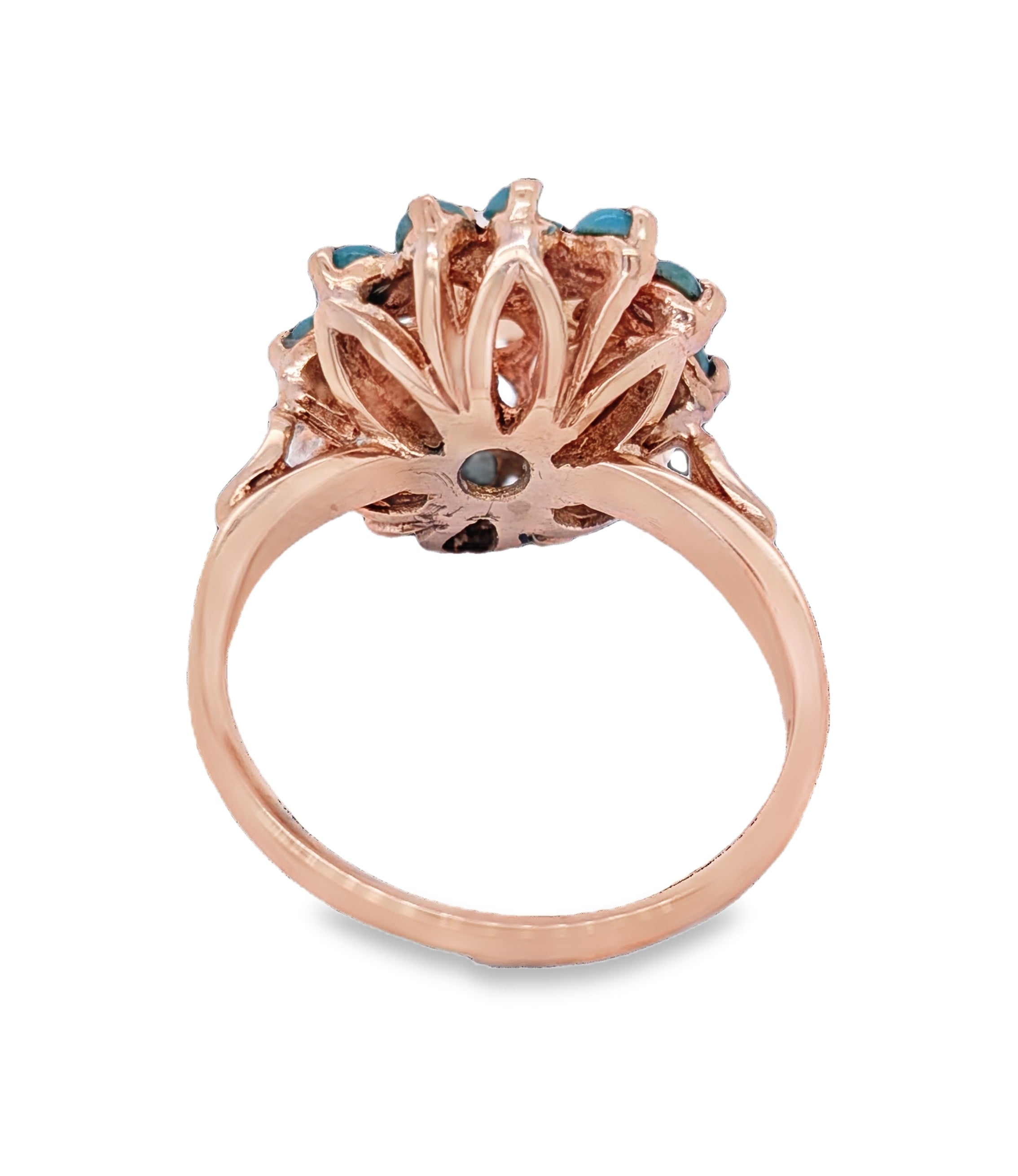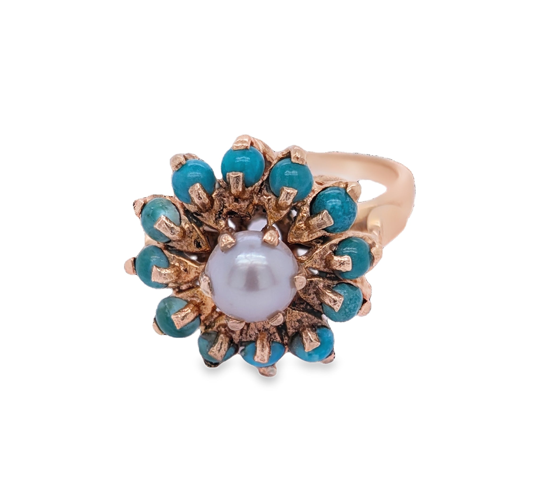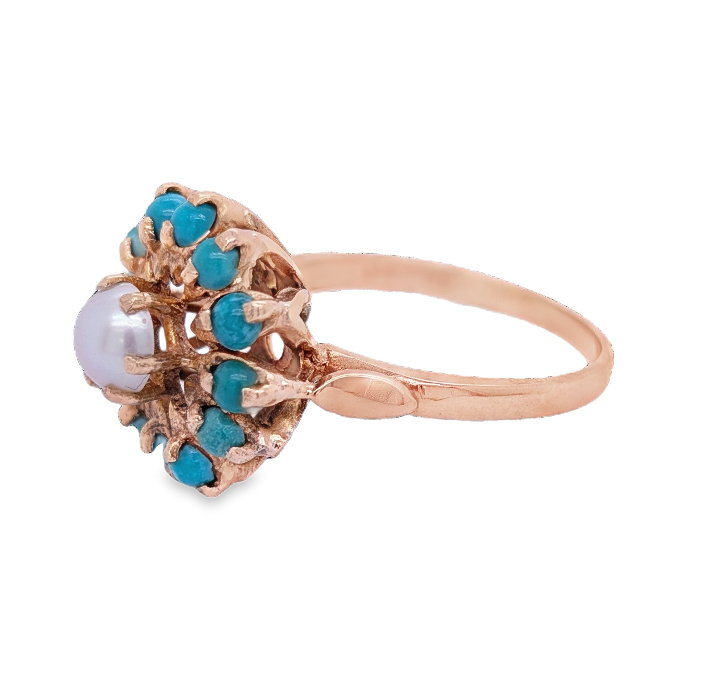 This charming ring is crafted from solid 9ct yellow gold and features a timeless, vintage-inspired design. At its heart sits a luminous pearl, perfectly round and delicately set to draw the eye with its soft, natural glow. Encircling the pearl are twelve vibrant turquoise stones, each one carefully placed to form a radiant halo of colour.