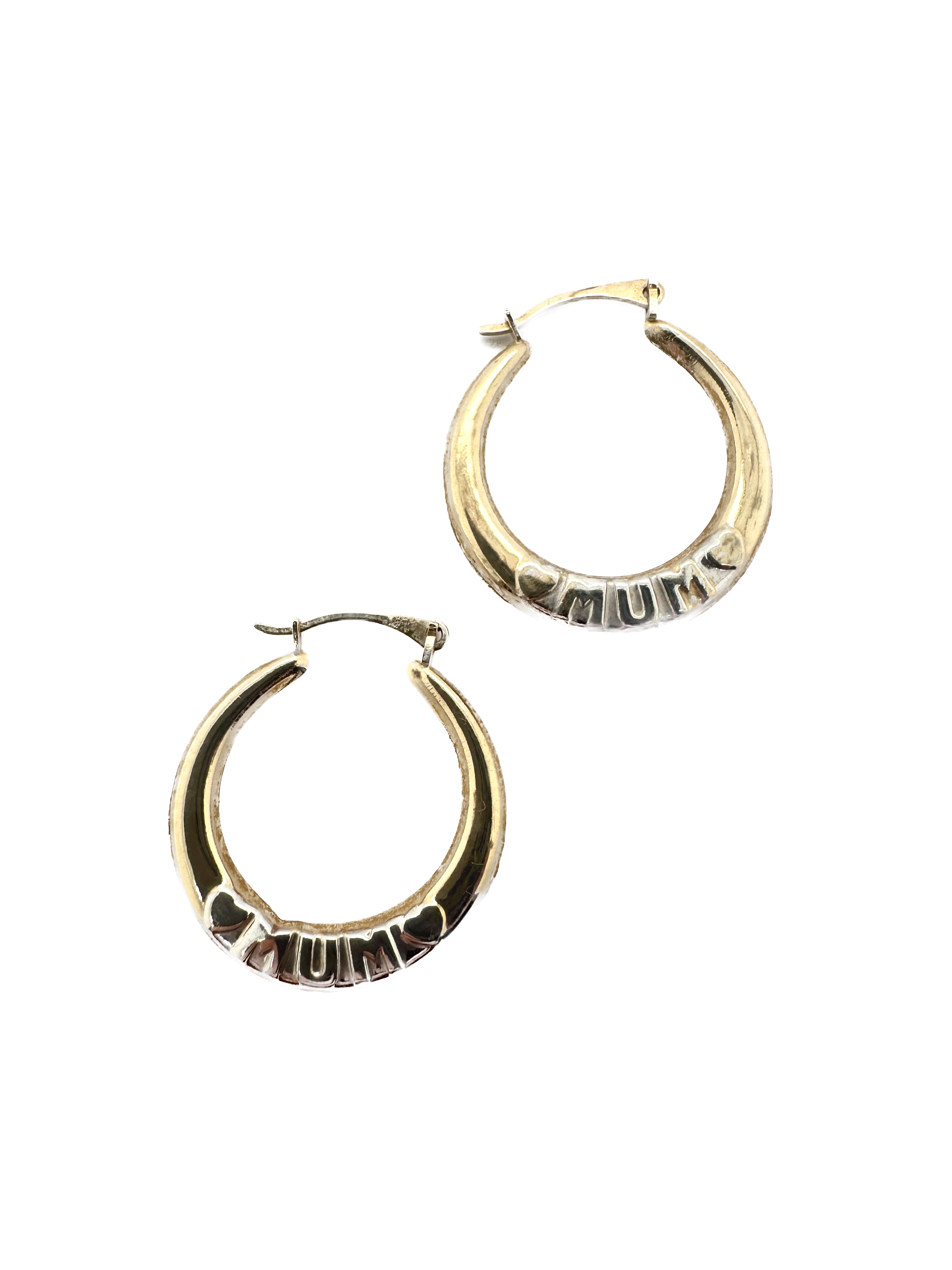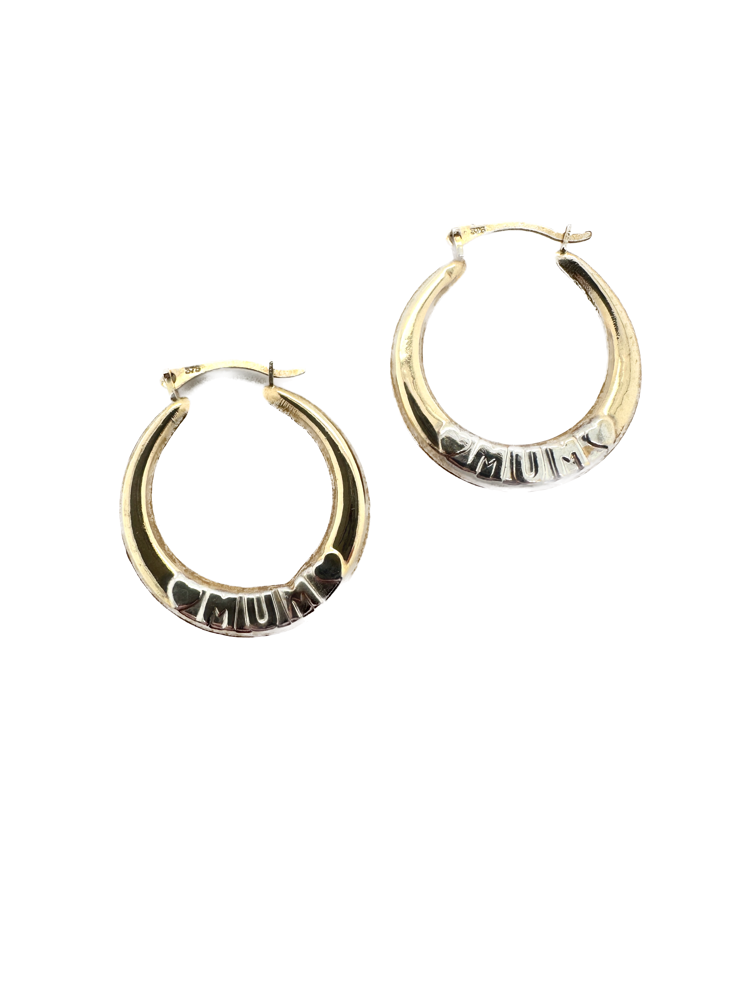 Each earring showcases the word "Mum" in polished white gold, elegantly placed at the base of the hoop, with a love heart on either side for added sentiment and style. The warm yellow gold hoops provide a classic backdrop, while the white gold detail adds a lovely contrast and a personal touch.