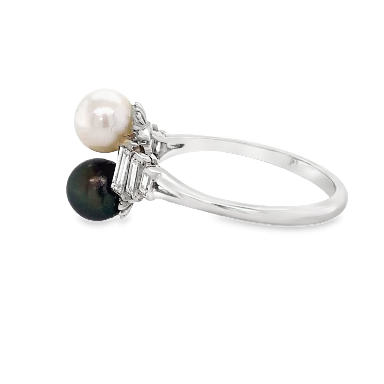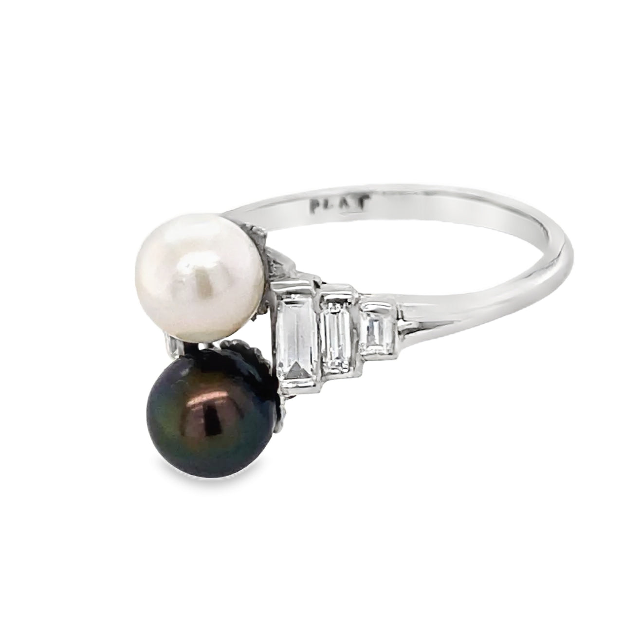 A double cultured white and black Pearl ring set with 6 baguette shape Diamonds. The Platinum signed ring consists of a 2mm band with a 1.5mm thickness. Baguette Diamonds make up the shoulders and graduate in size. The Diamonds range from 0.16ct - 0.03ct with a total Diamond carat weight of 0.6ct. The Pearls are 6mm and reflect beautifully against the Platinum mount and white sparkling Diamonds.
