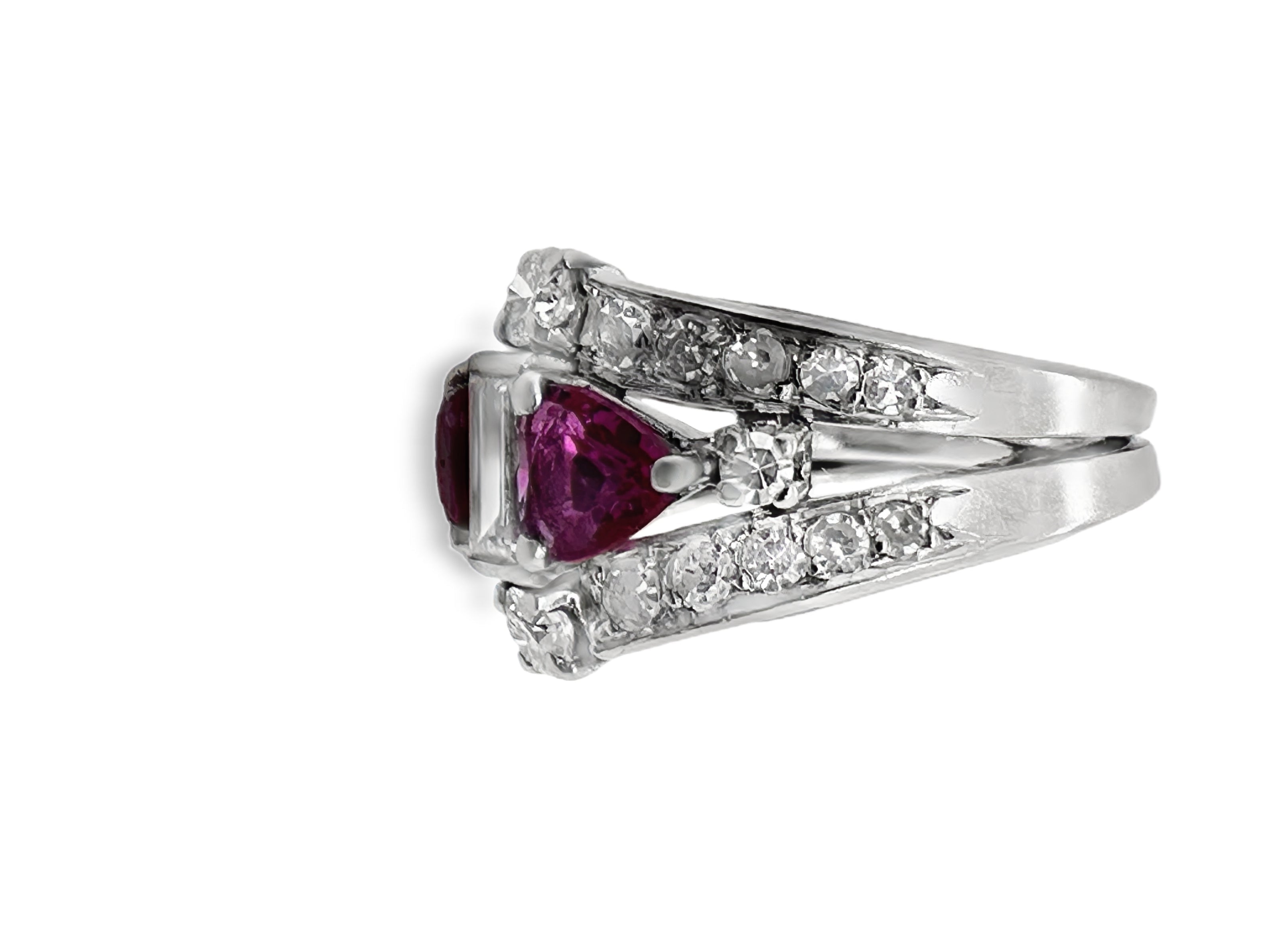 This stunning Diamond and Ruby Ring is a striking blend of vintage charm and luxurious sparkle. At its heart lies a beautifully proportioned 6x4mm baguette cut diamond, weighing approximately 0.60ct, which forms the elegant focal point of the design.