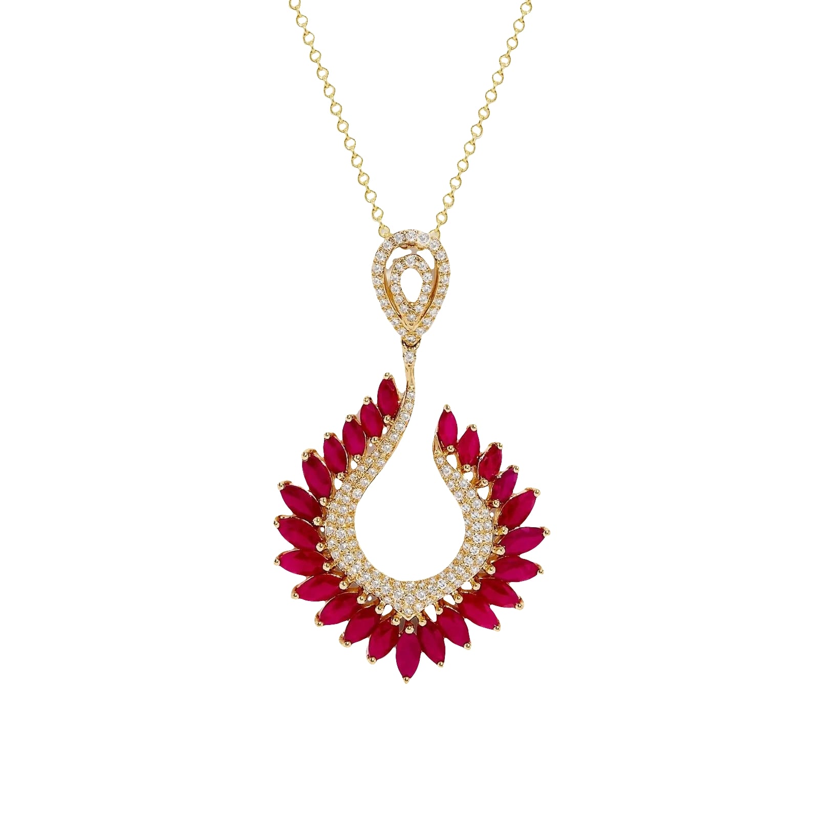 The rubies are accentuated by 125 brilliant round-cut diamonds totaling 0.47 carats, adding sparkle and contrast to the warm gold and fiery red tones. The total carat weight of this magnificent pendant is 4.88 TCW, making it a true showstopper.