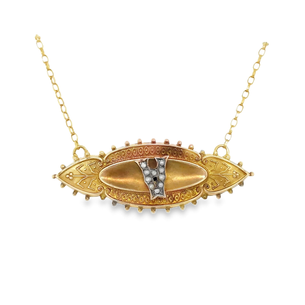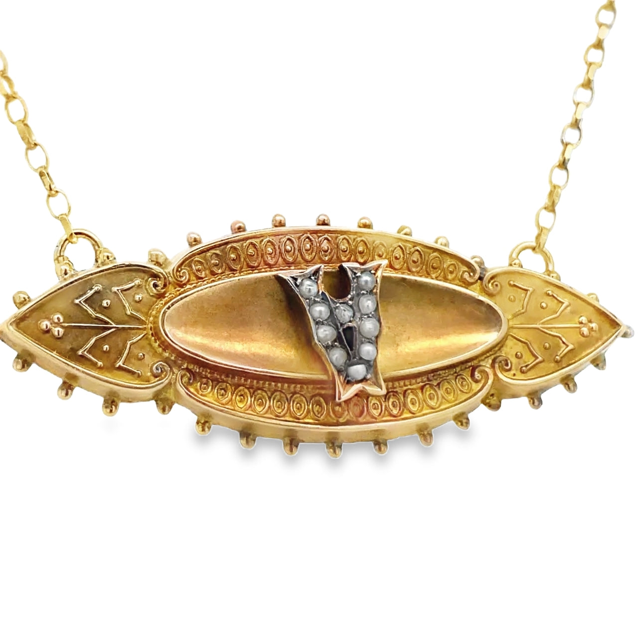 1893 Antique 9ct Gold Pendant with Seed Pearls – Converted Brooch on 16" Belcher Chain