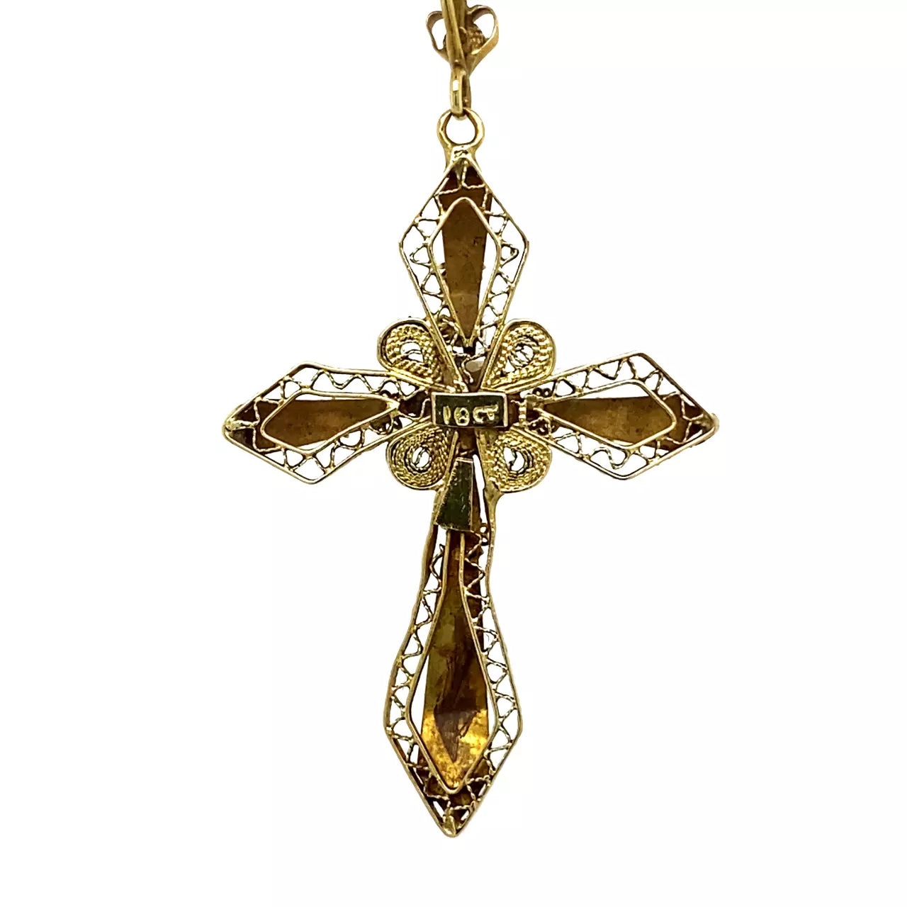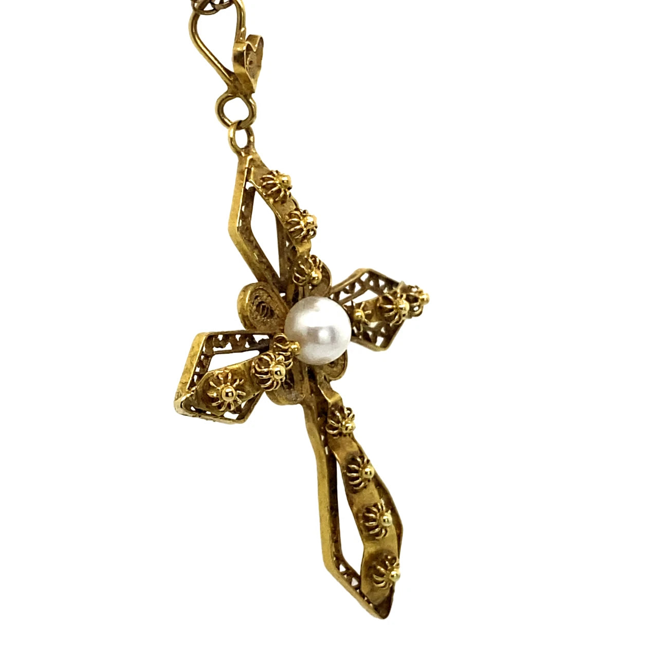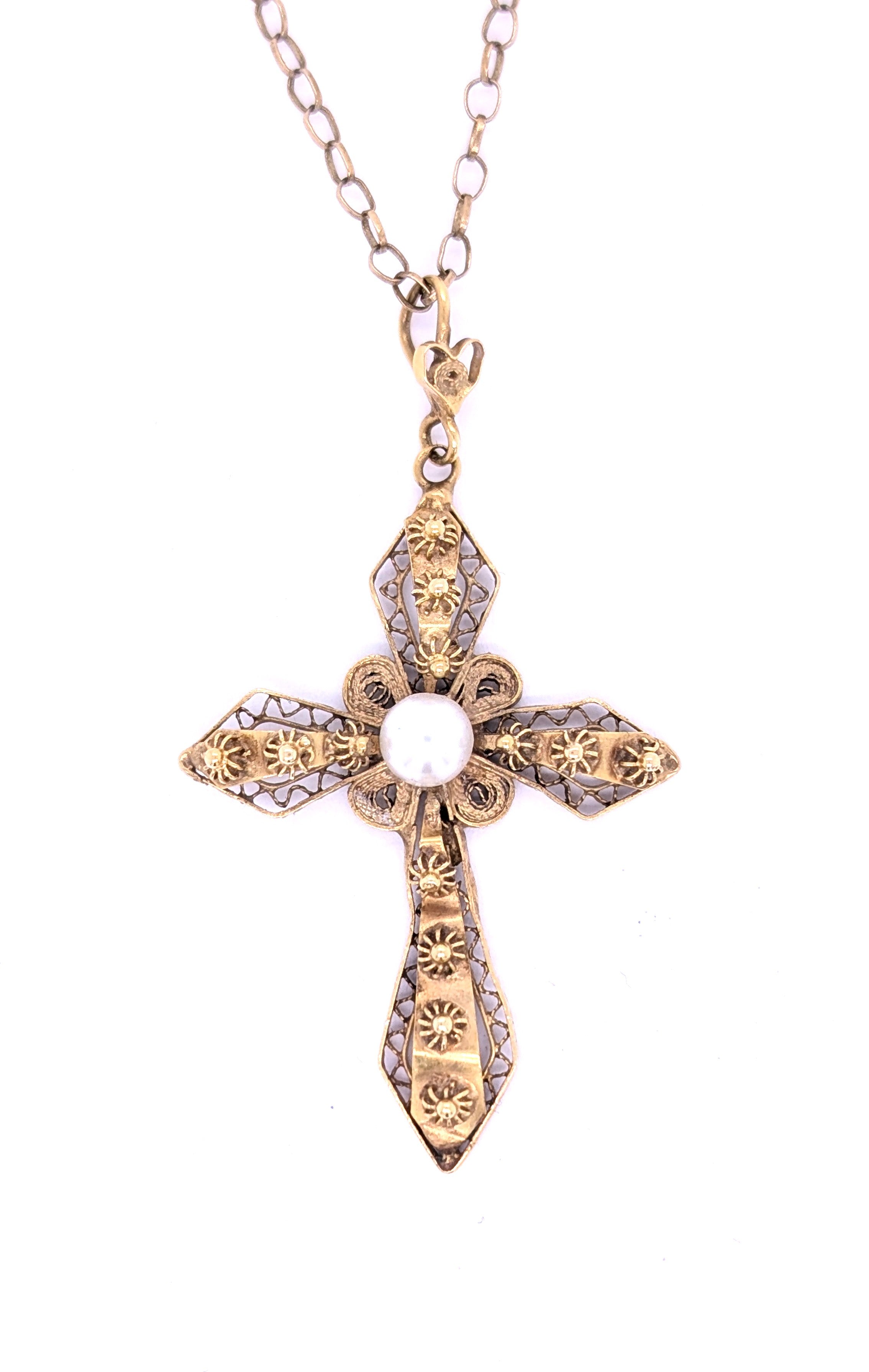 This is an 18ct yellow Gold filigree cross with a 5mm cultured Pearl in the center. The chain is a fine 9ct yellow Gold belcher chain. The Pearl is approximately 4.8mm. The cross measures 40 x 28mm and is signed on the back "18ct". The pendant is dated 1930's.