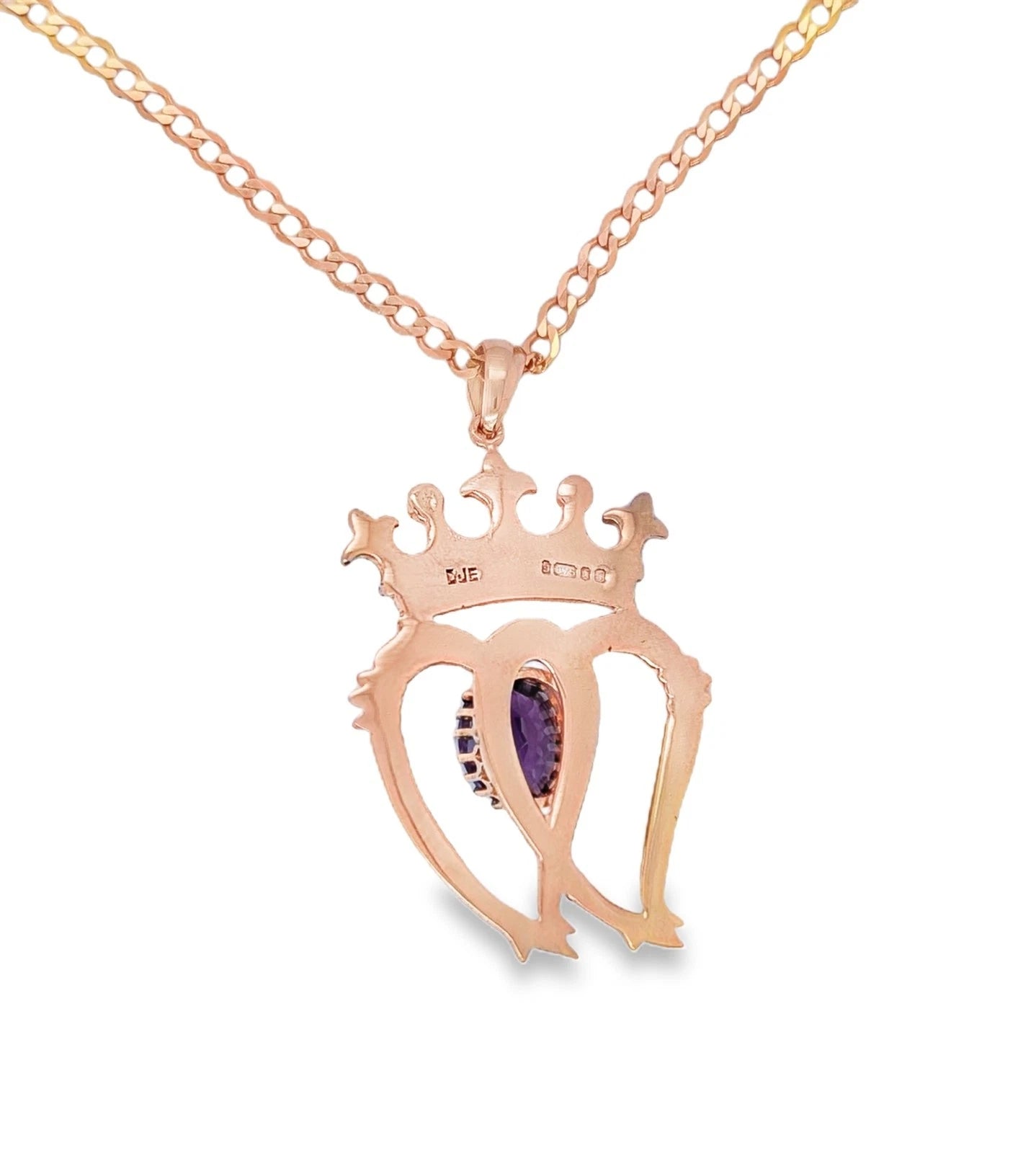 At the centre of the pendant sits a rich purple amethyst, an oval-cut stone measuring 10x8mm, perfectly set to catch the light and add a touch of regal colour to the piece. The warm glow of the gold complements the deep violet of the gemstone, creating a timeless and elegant look.