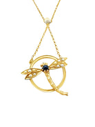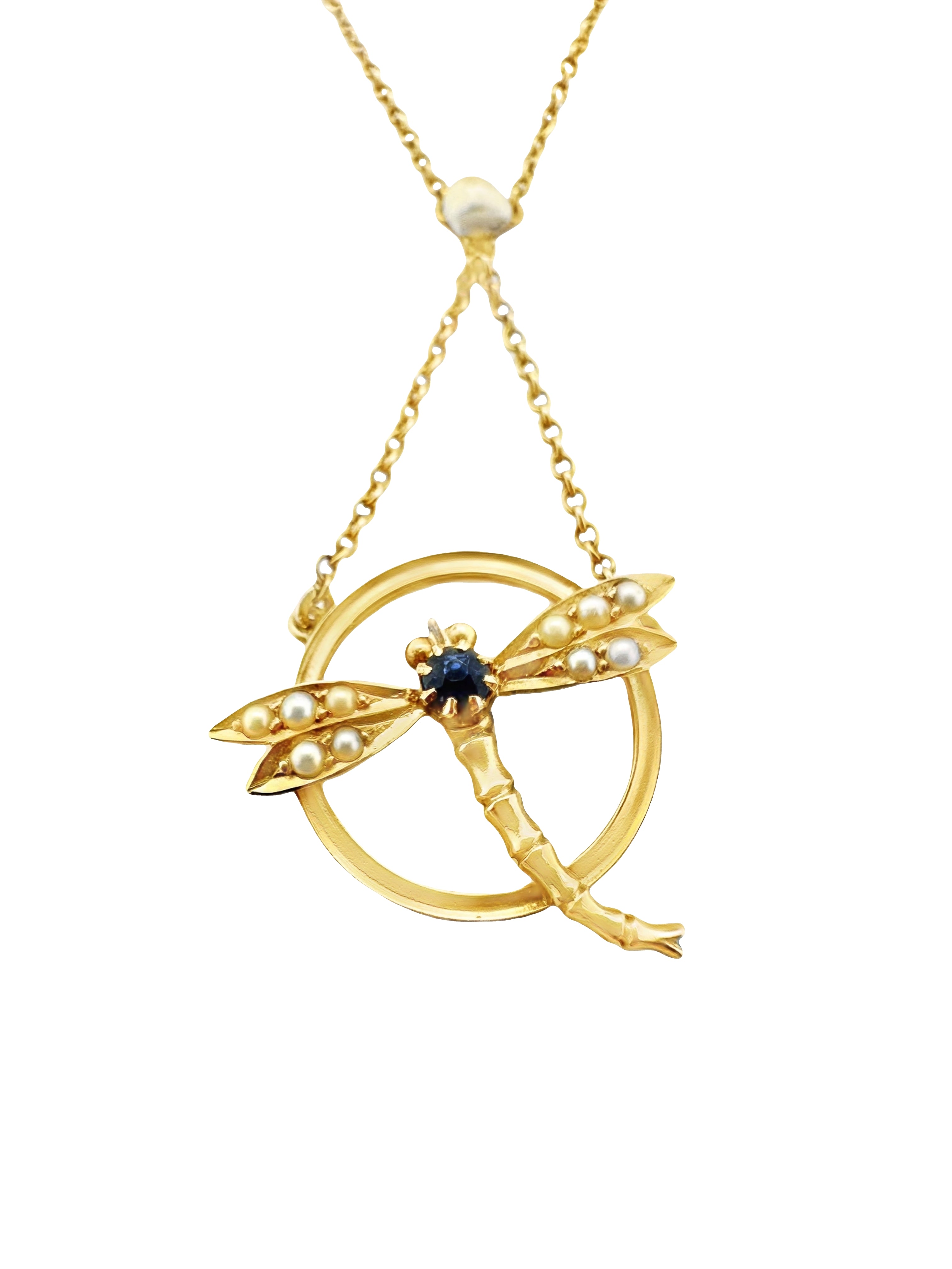 A beautifully detailed 9ct yellow gold dragonfly pendant, paired with a classic belcher chain. This enchanting design features a sapphire set at the head of the dragonfly, with five delicate seed pearls on each wing.