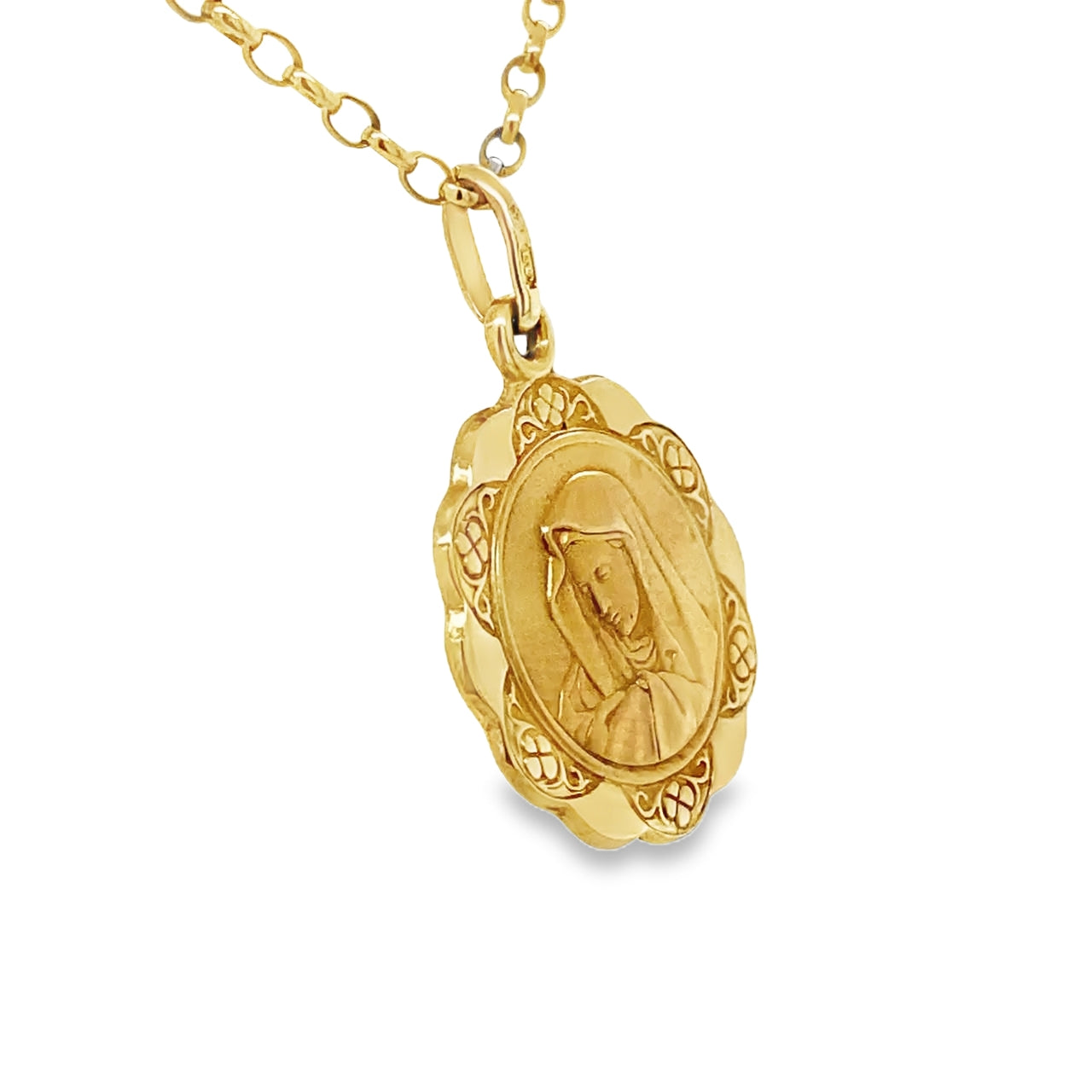 The pendant features a detailed depiction of the Madonna, symbolising protection, love, and devotion. Measuring 18mm x 17mm with a subtle 2mm thickness, it’s a discreet yet meaningful piece perfect for daily wear or as a cherished gift.