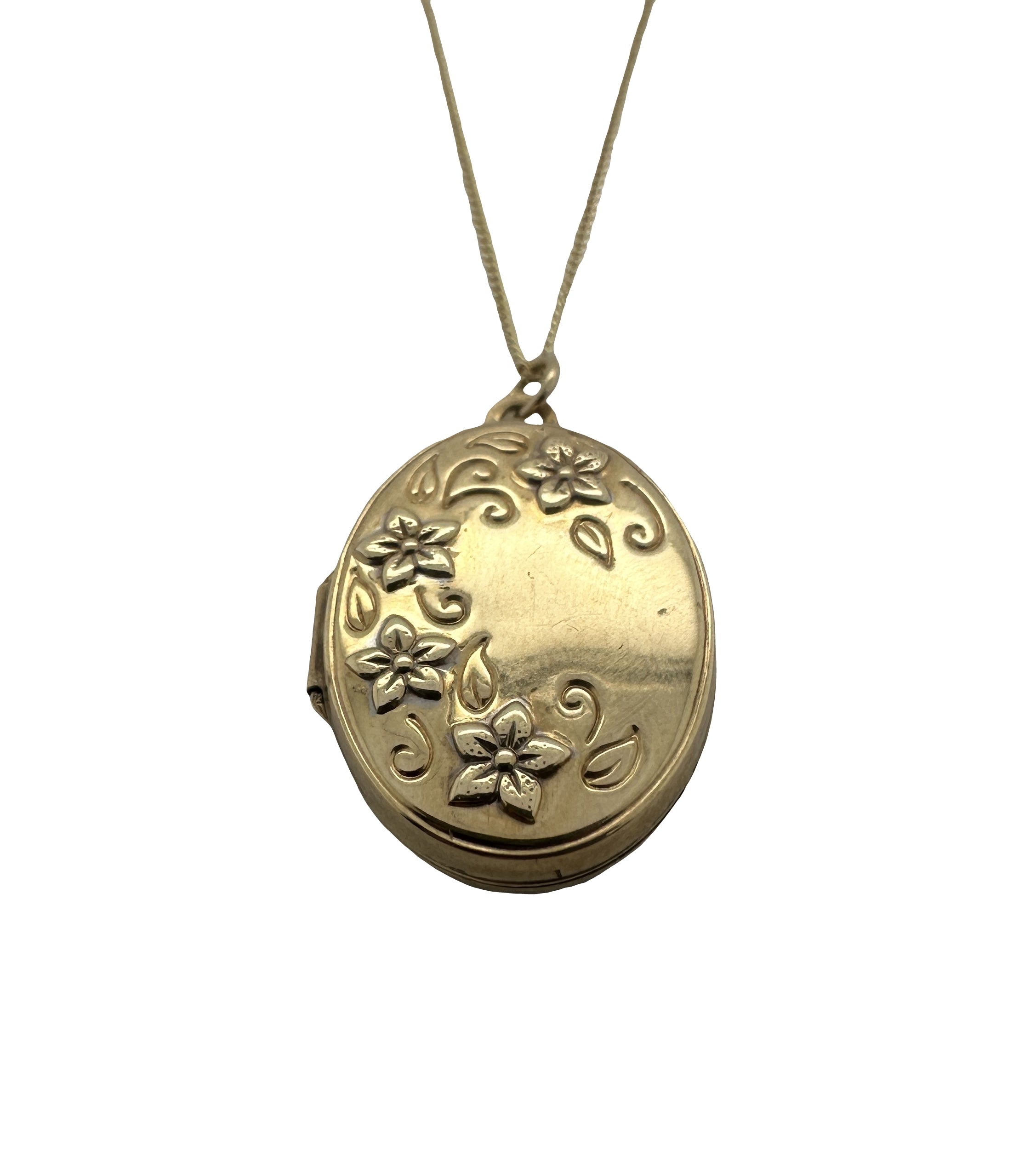 This charming 9ct yellow gold oval pendant features a beautifully detailed floral engraving across the front, with delicate flowers and flowing scrollwork that give the piece a timeless, vintage-inspired feel. The softly polished gold catches the light wonderfully, highlighting the intricate engraved design.