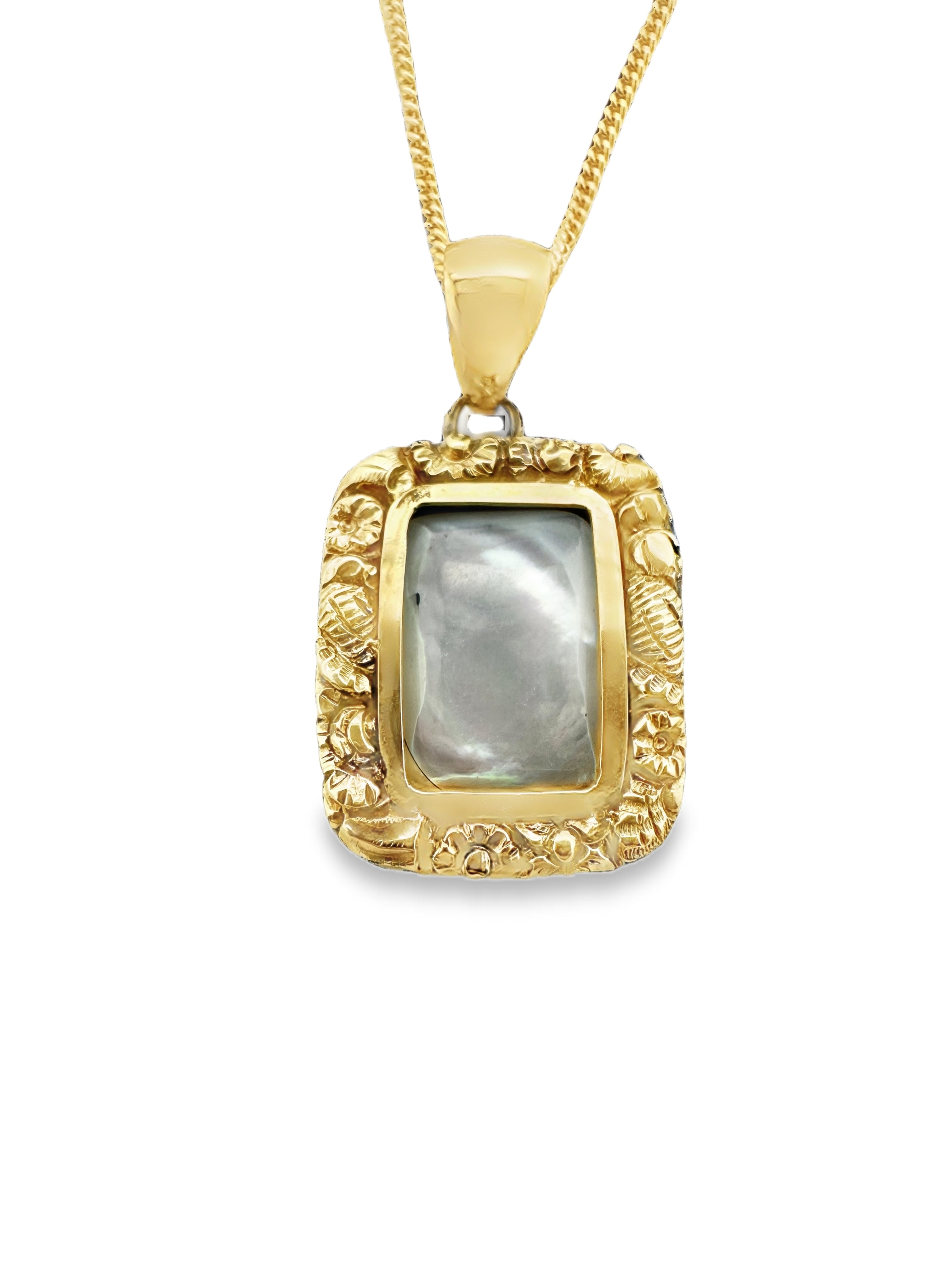 Step back in time with this authentic 1814 mourning pendant, crafted in 9ct yellow gold and rich with historical significance and delicate craftsmanship. This rectangular pendant features an elegant floral design, framing a luminous mother of pearl centrepiece (12mm x 8mm), symbolising purity and remembrance.