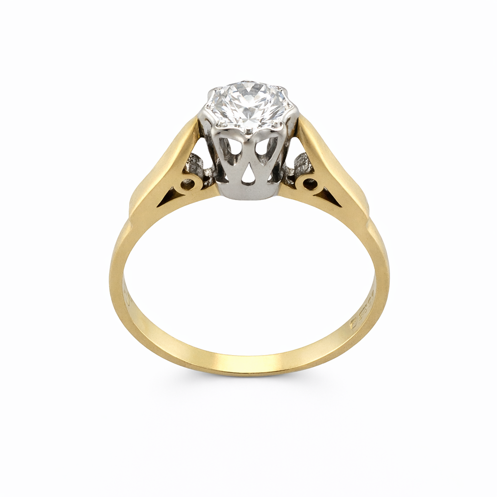 A beautifully refined piece, this 18ct yellow gold solitaire ring features a dazzling 0.23-carat princess cut diamond, elegantly held in a white gold collet to enhance the diamond’s brilliance. The contrast between the warm yellow gold band and the cool white gold setting creates a timeless and sophisticated look.