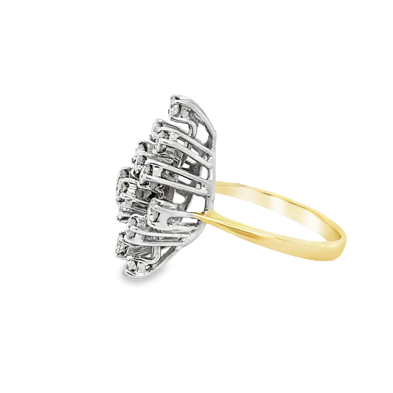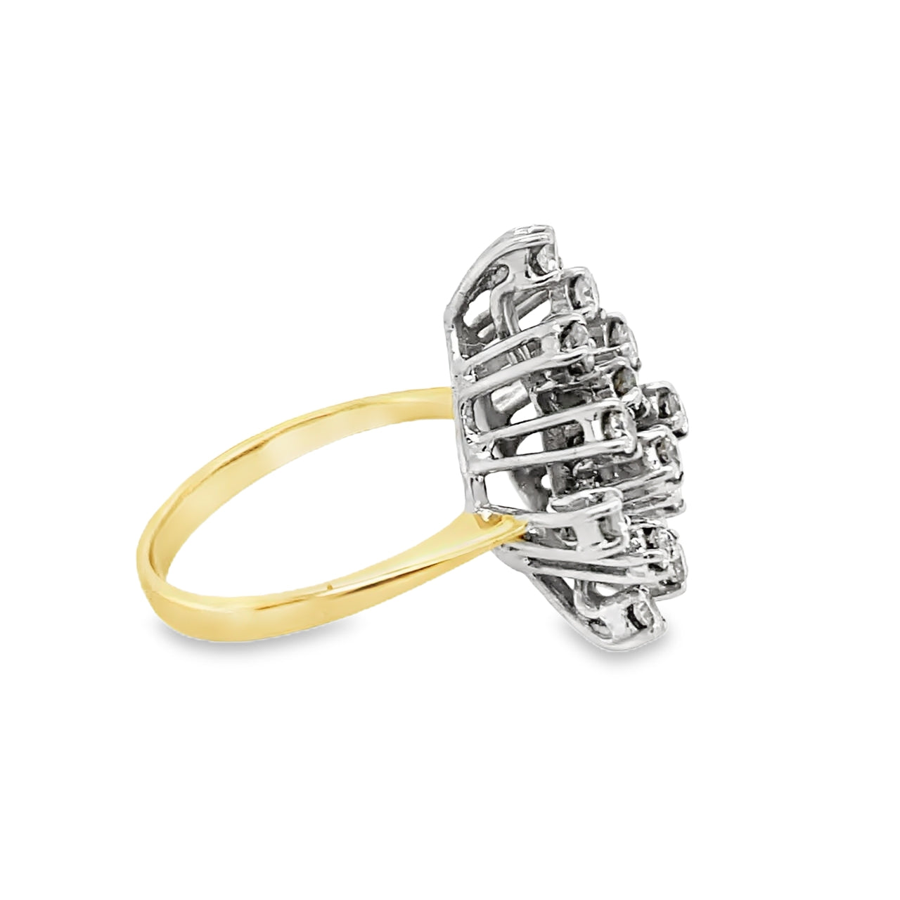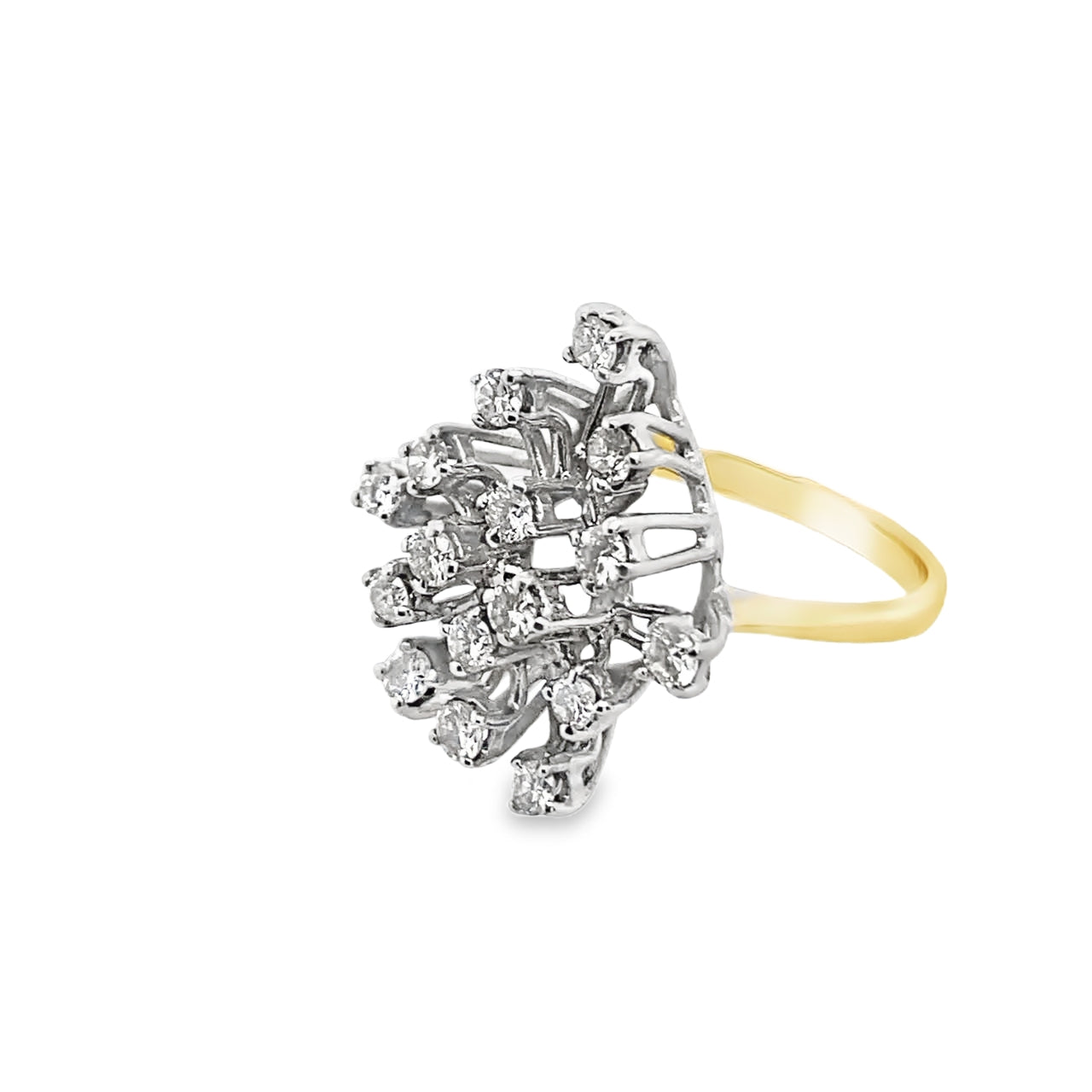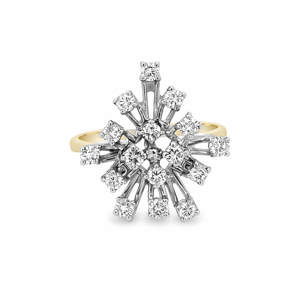 18ct yellow Gold fancy Diamond cluster ring with a total carat weight of approximately 0.8ct. The 3 tier ring consists of 16 brilliant cut white Diamonds all individually prong set with an open gallery. The stones are roughly 0.05ct each, totaling 0.8ct. The width of the yellow Gold band is 2mm.