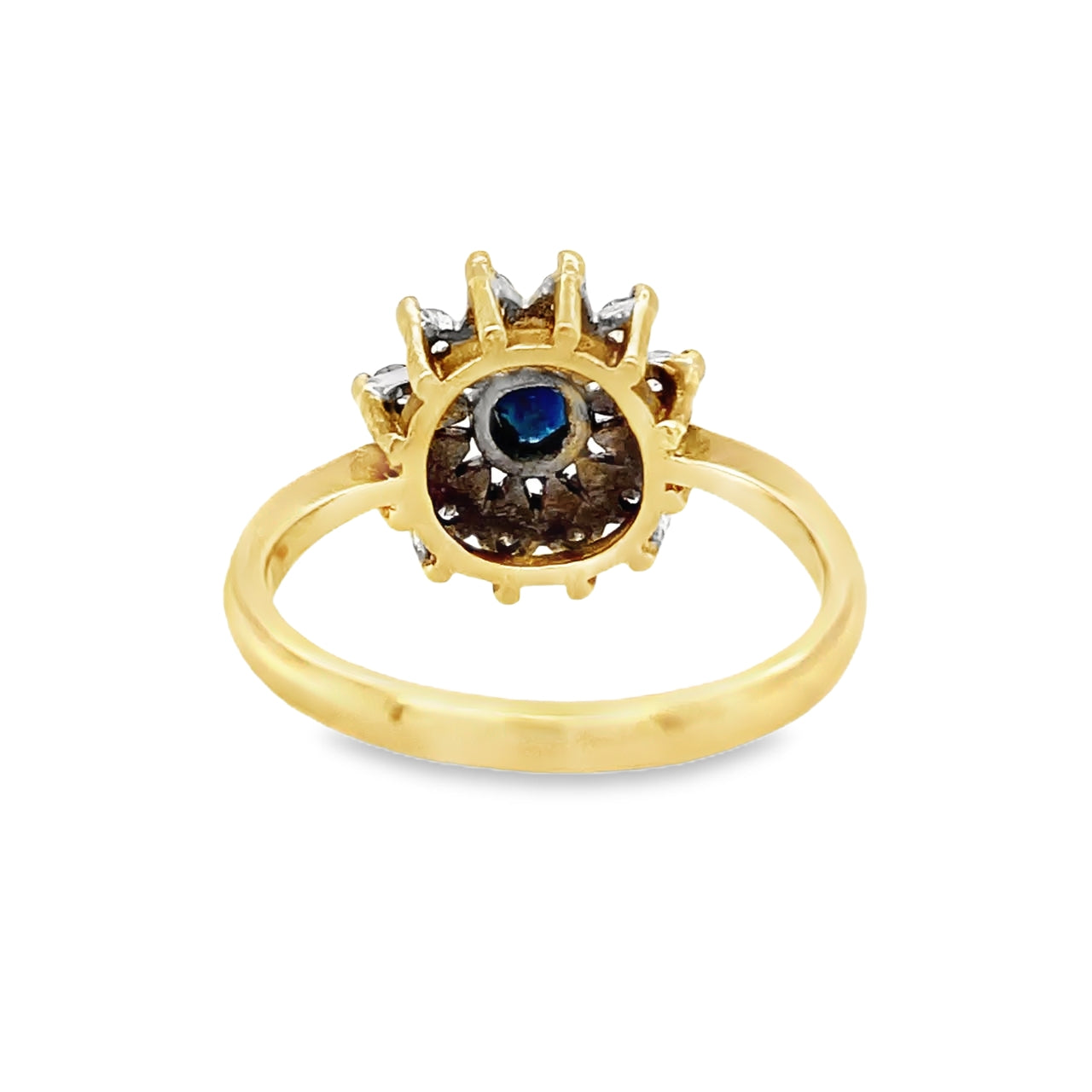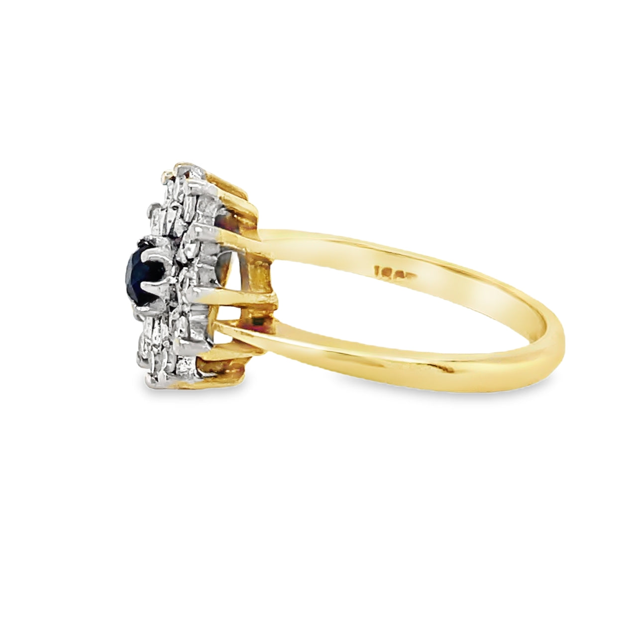 Crafted from 18ct yellow Gold and featuring a round Sapphire in the center of this ring weighing in at approximately 0.10ct (3mm). Surrounding this gemstone there are 12 shimmering Diamonds which have a total Diamond carat weight of 0.36ct. All the stones are prong set. The band tapers to 2.2mm with a thickness of 1.4mm. It is marked inside "18ct".