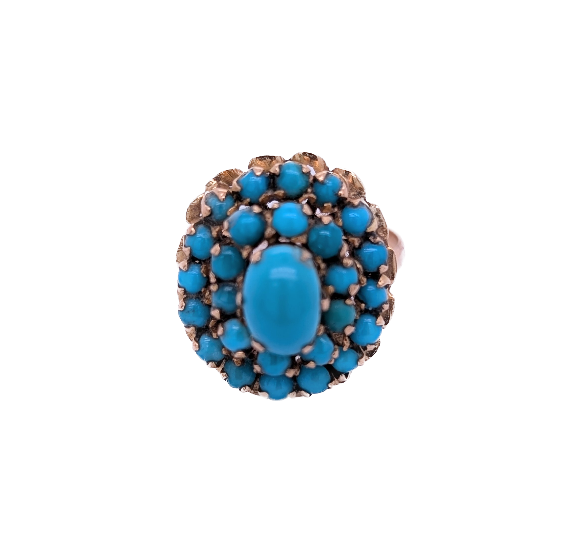 This striking gold ring features a bold and beautifully set oval turquoise stone at its centre, surrounded by two dazzling rows of smaller turquoise stones. The layered design creates a rich, dimensional effect, drawing attention to the vibrant blue-green tones of the natural stones. Each turquoise is carefully matched for colour and quality, creating a cohesive and eye-catching piece.