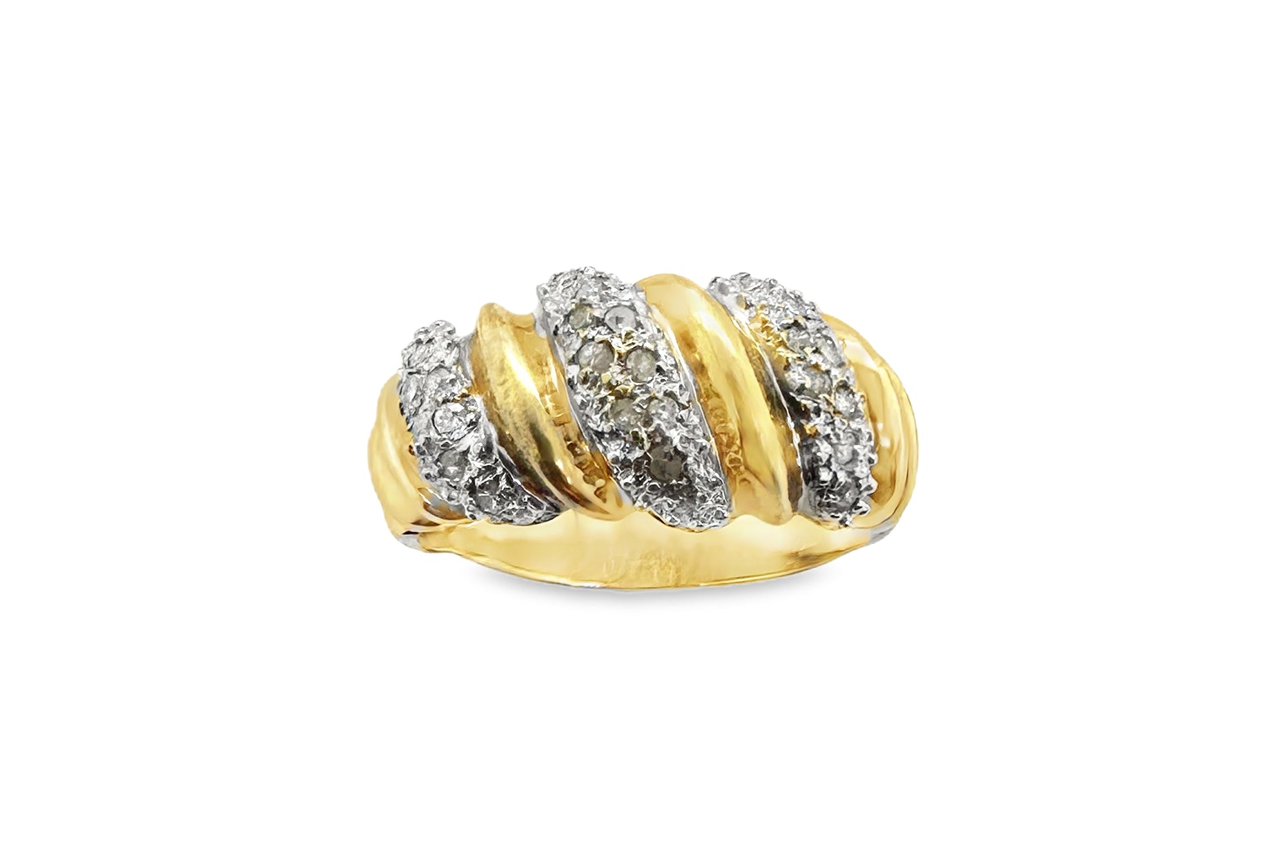 This striking 9ct yellow gold and diamond cross-over top ring features an eye-catching, sculptural design with alternating polished gold and diamond-set sections. The cross-over style creates depth and movement, while the diamonds add sparkle and contrast against the rich yellow gold.