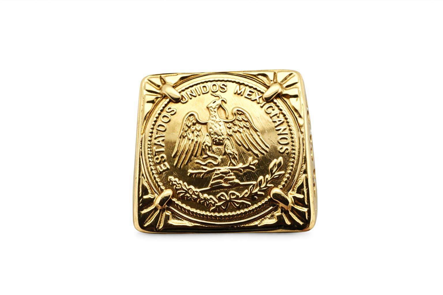 Celebrate bold design and cultural heritage with this striking 9ct yellow gold Dos Pesos coin ring. Expertly crafted, it features a genuine Mexican Dos Pesos coin mounted in a secure four-claw setting on a solid gold band. The ring showcases the iconic “Estados Unidos Mexicanos” emblem — an eagle perched on a cactus with a serpent in its beak — a powerful symbol of strength and identity.