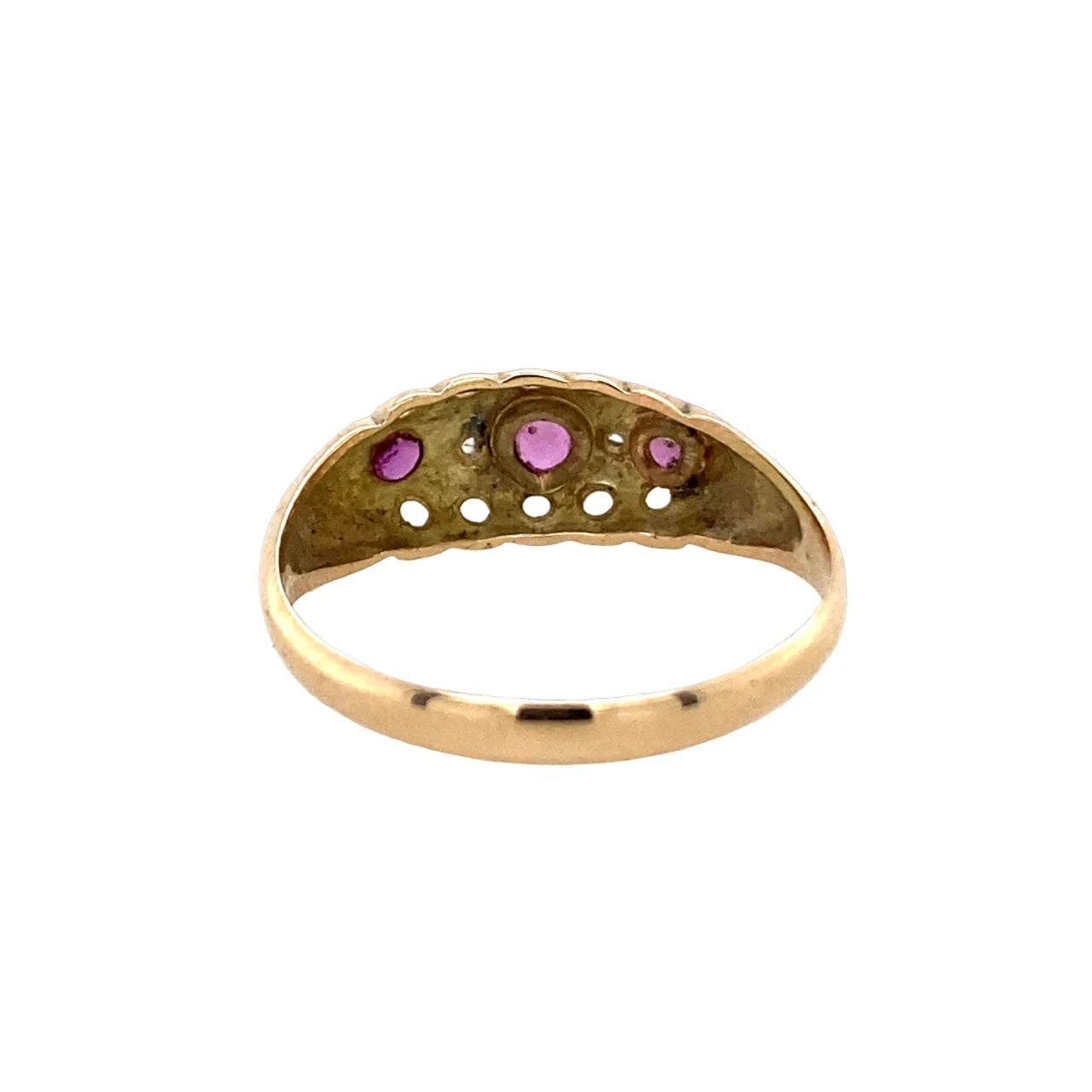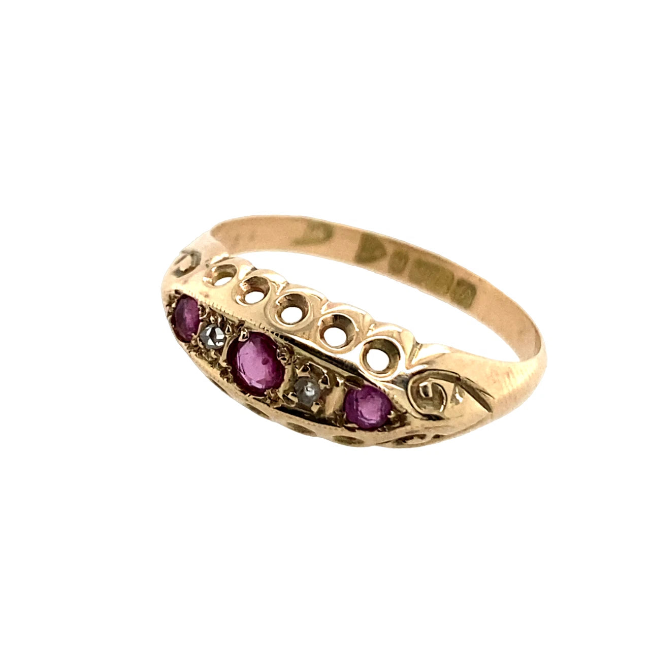 The design features graceful gold scrolls set with three old cut natural rubies, with the central ruby slightly larger, creating a balanced and eye-catching focal point. Nestled between the rubies are two micro diamonds, adding a subtle sparkle that enhances the richness of the red gemstones.