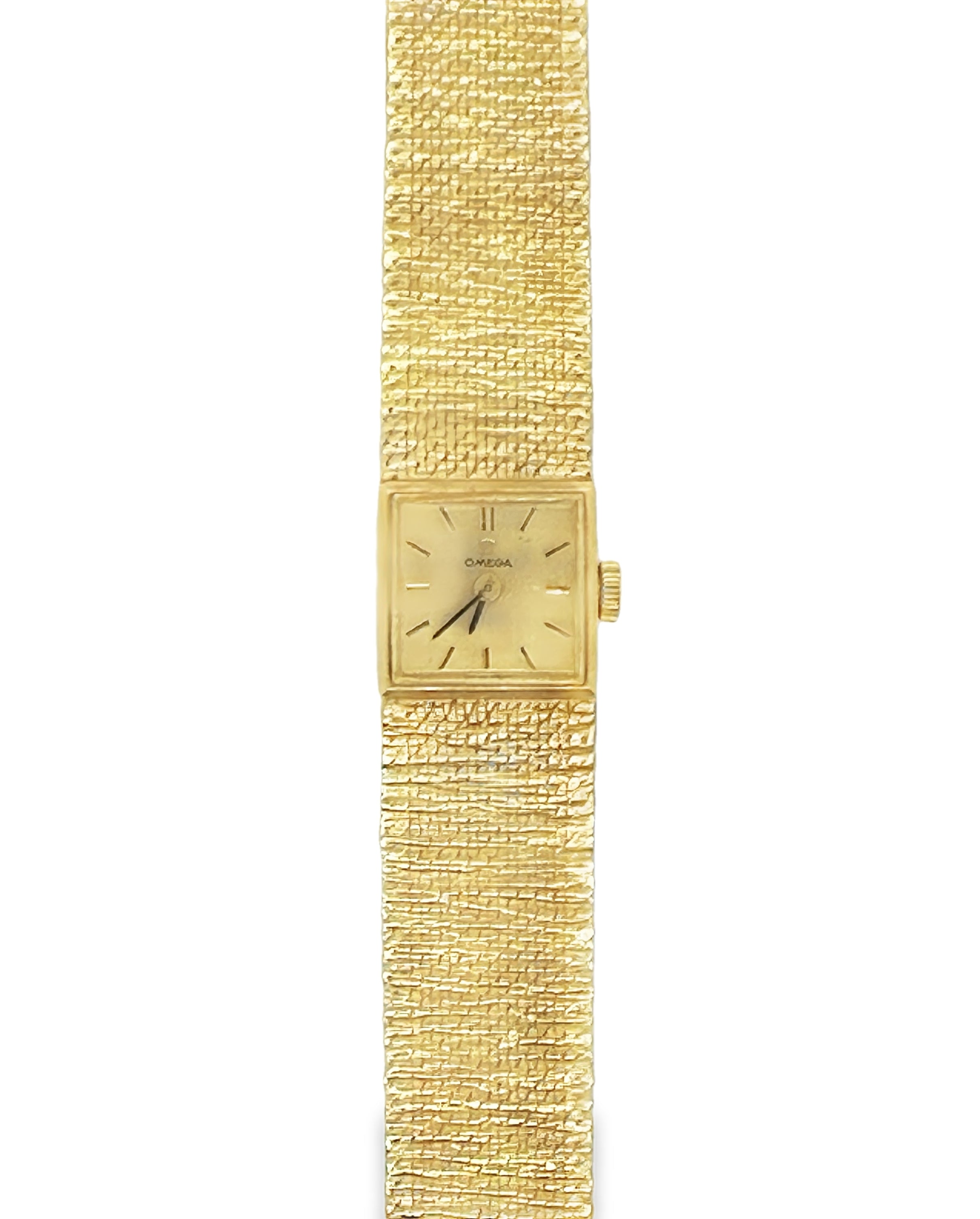 For sale is a stunning ladies Omega mechanical wristwatch in 9ct yellow gold, featuring a beautifully textured barked finish bracelet that adds a touch of vintage glamour and uniqueness to this elegant timepiece.