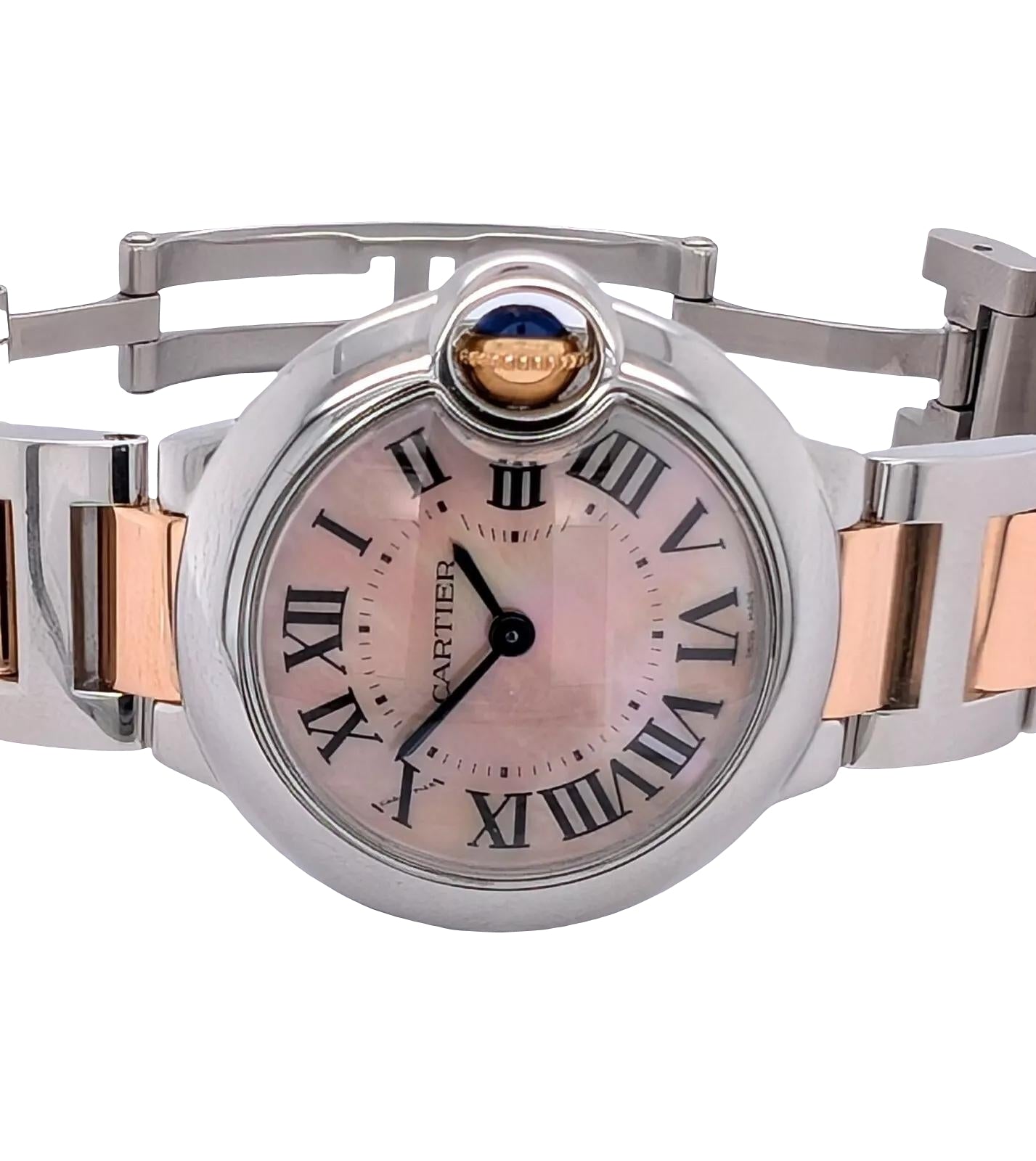 Indulge in timeless elegance with this exquisite Cartier Ballon Bleu Ladies Quartz Watch, a symbol of sophistication and luxury. Designed for those with an eye for beauty, this watch features a stunning mother-of-pearl dial, a delicate yet striking detail that shimmers with every movement. Paired with a two-tone stainless steel and rose gold bracelet, this timepiece exudes refined glamour, making it perfect for both everyday wear and special occasions.