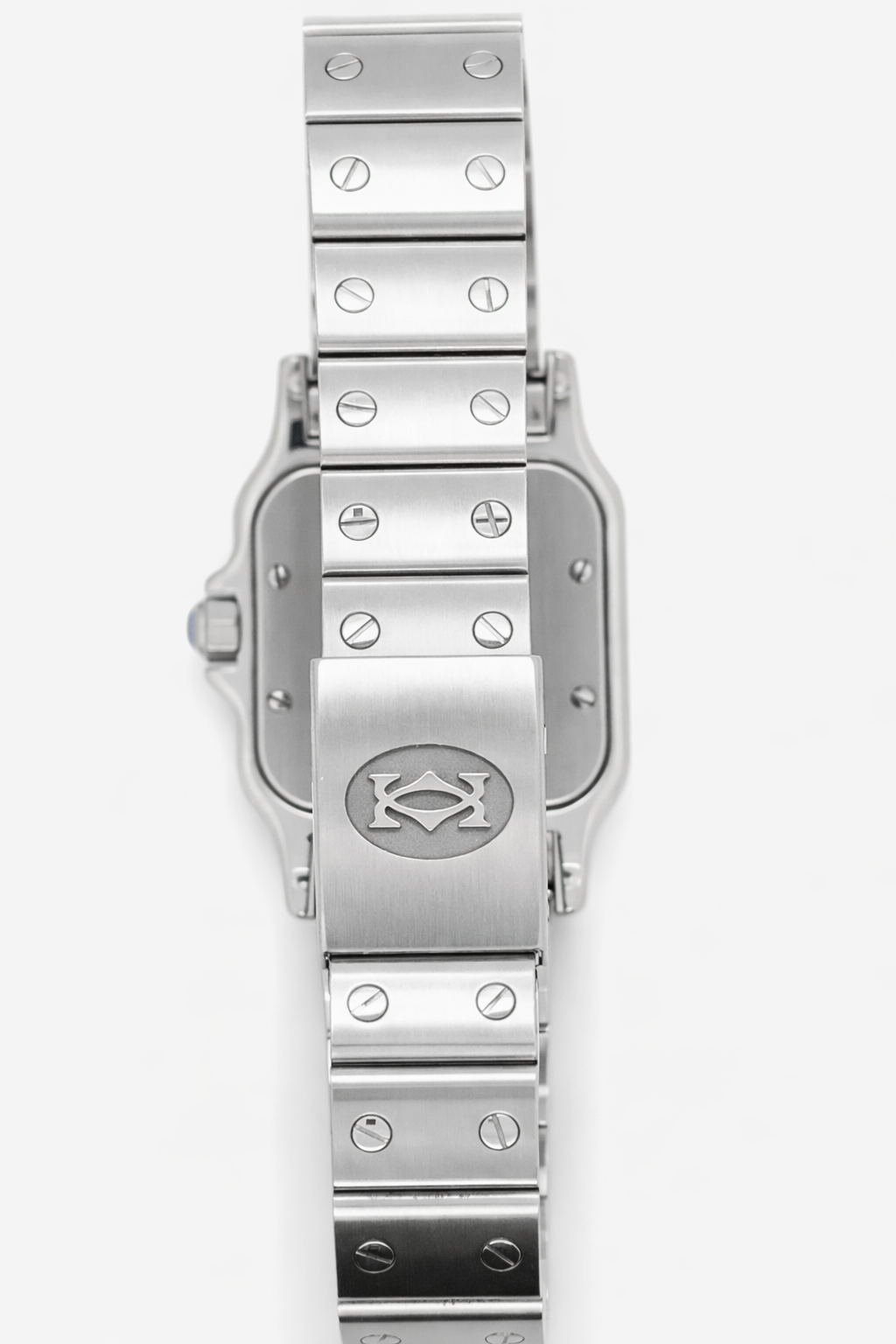 This watch is crafted from stainless steel and showcases the signature square case with rounded edges, a hallmark of the Santos collection. The dial features Cartier’s iconic Roman numerals, elegant blued steel hands, ensuring a timeless and versatile look suitable for any occasion.