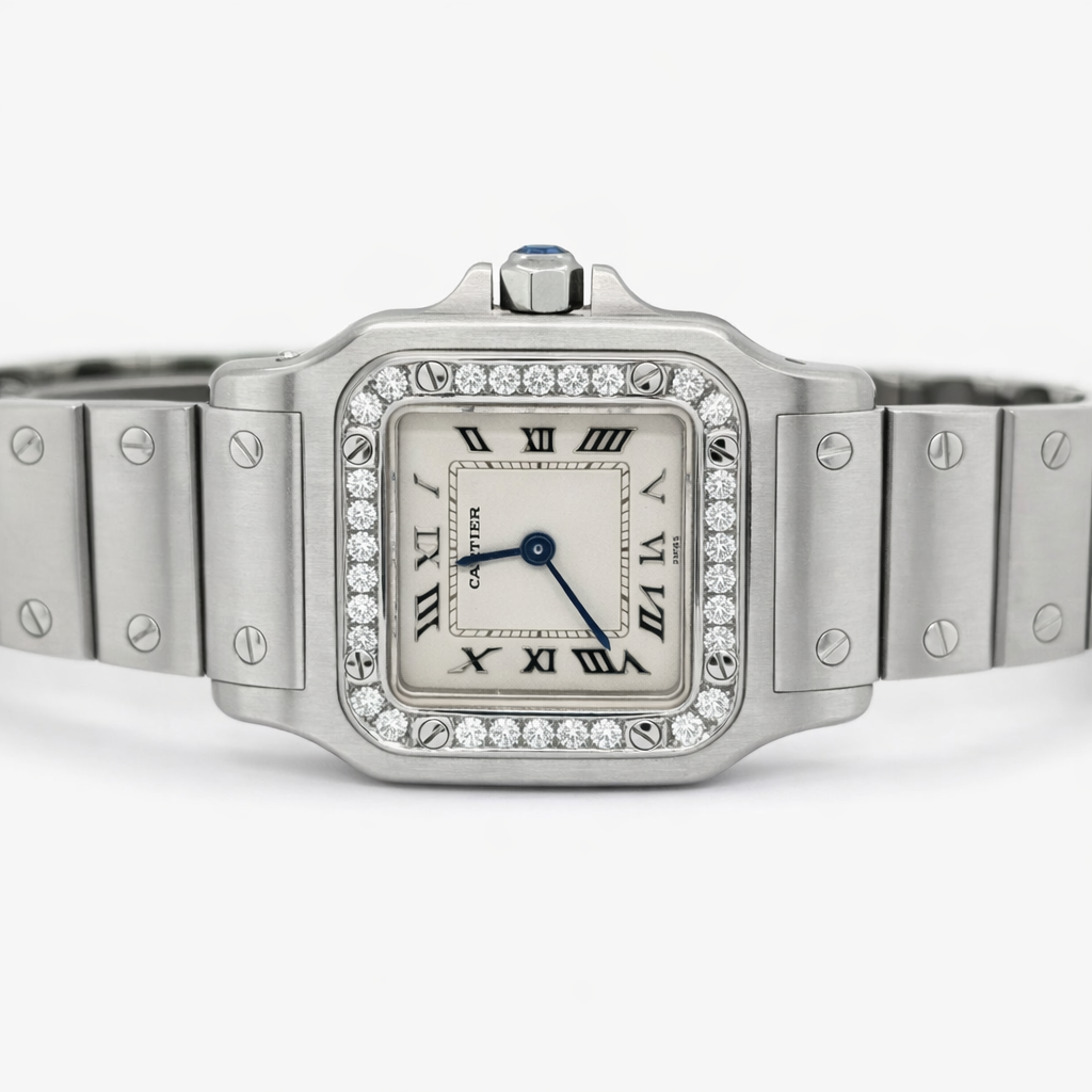 What sets this particular piece apart is its custom diamond bezel, adorned with high-quality, brilliant-cut diamonds that elevate the watch to a new level of sophistication. Whether worn as a statement piece or a daily companion, this Cartier Santos exudes confidence and style.