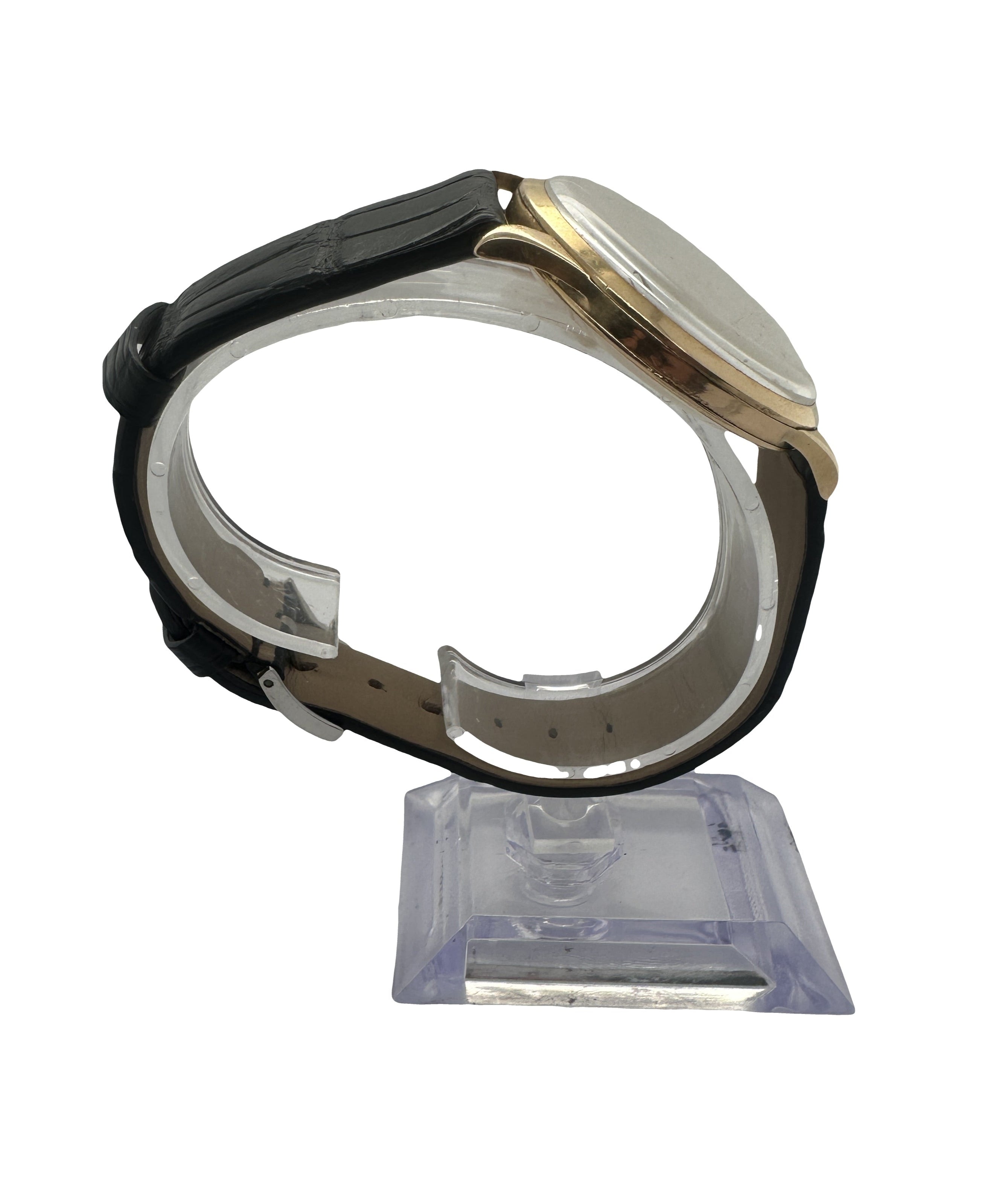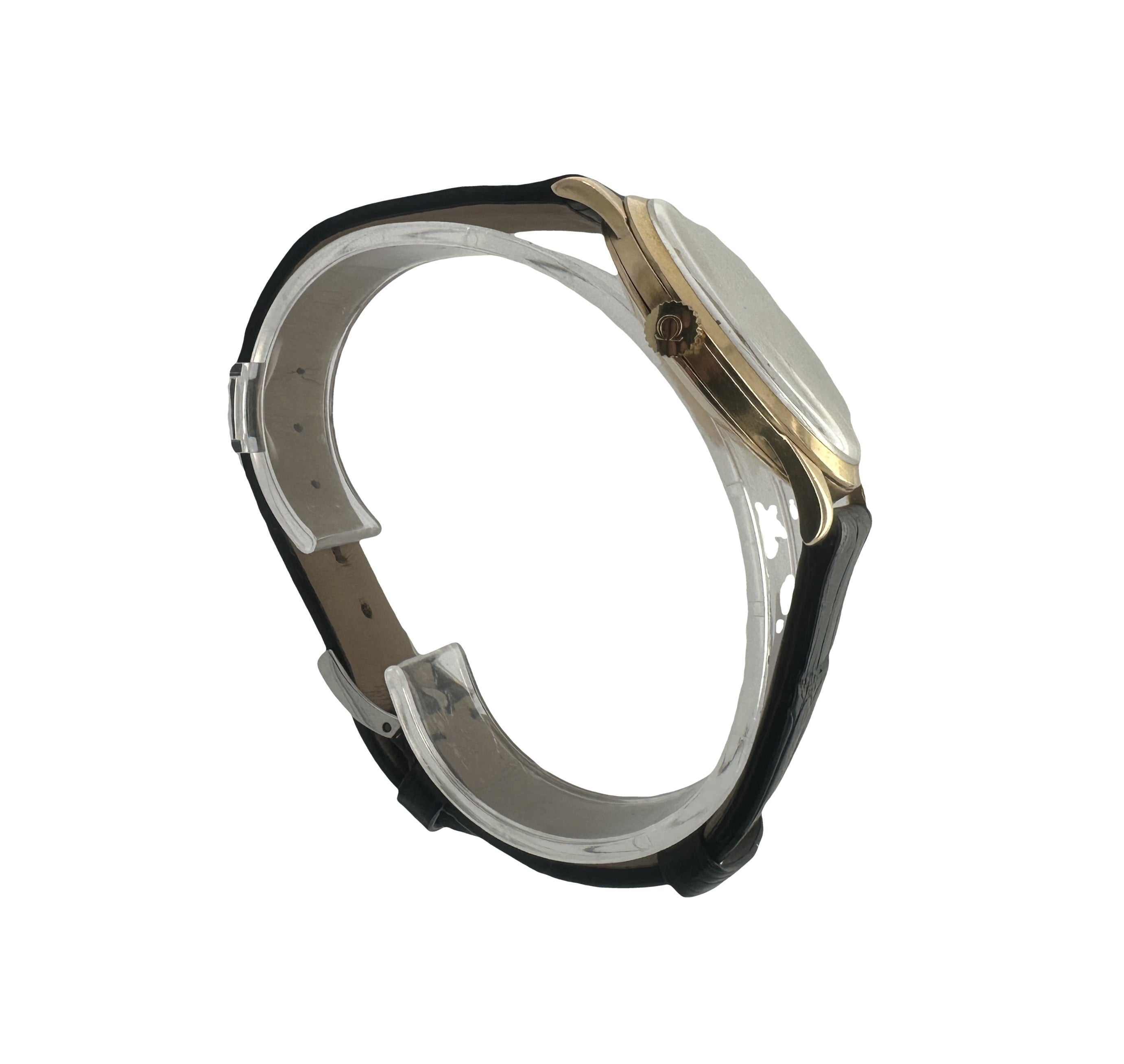 The watch is fitted with a black leather Omega strap and traditional Omega buckle, complemented by the original Omega crown. Despite its age, this watch maintains accurate timekeeping, a testament to Omega’s renowned mechanical craftsmanship.