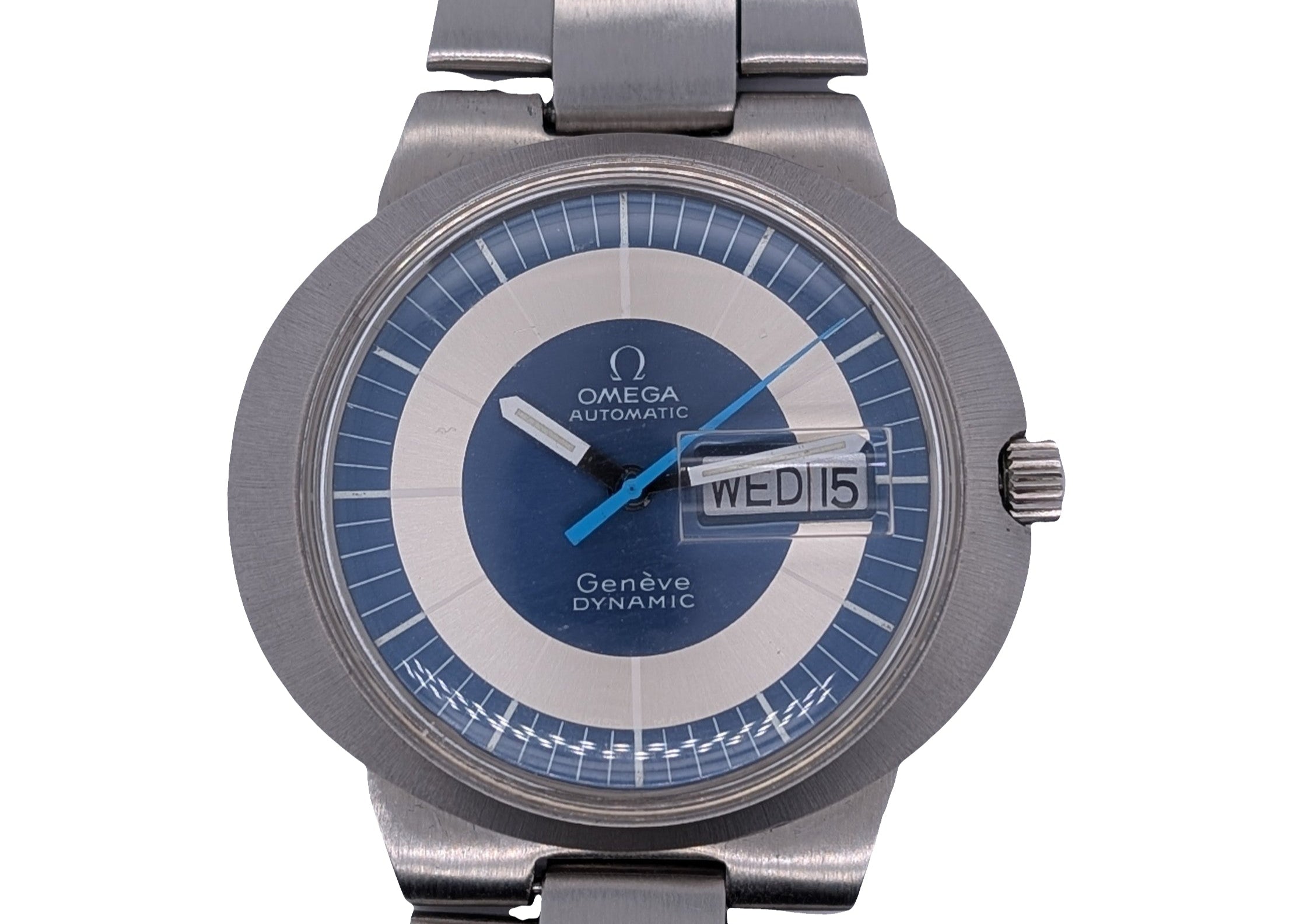 Presenting the striking Omega Genève Dynamic Ref. 166.079, a vintage automatic men’s watch that captures the bold design spirit of the late 1960s and early 1970s. With its distinctive blue and white bullseye dial, this timepiece is instantly recognisable and highly sought-after among vintage Omega collectors.