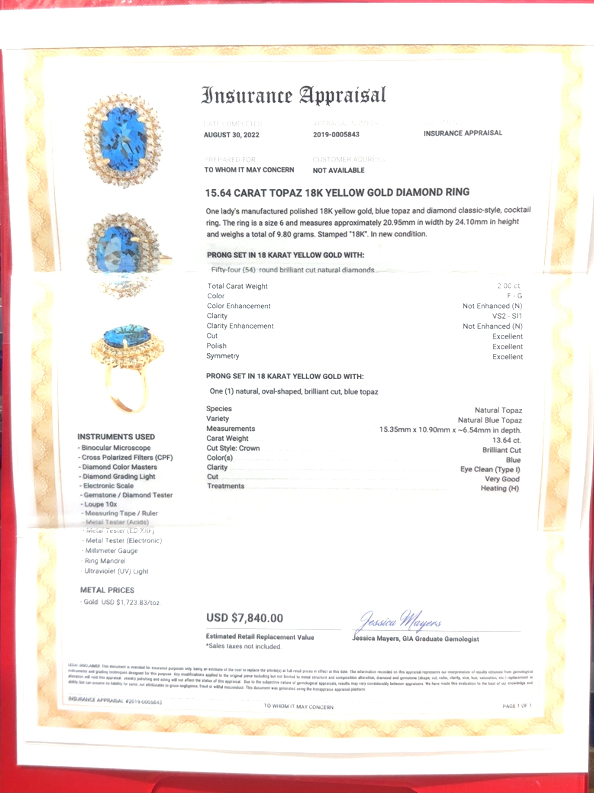 Elevate your jewellery collection with this breathtaking halo ring, crafted in luxurious 18ct yellow gold. At the centre of this stunning piece is a vibrant 13.64ct blue topaz, known for its captivating, ocean-blue hue and exceptional clarity.