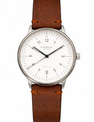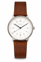 The crisp white dial is beautifully balanced with minimalist markers and housed within a polished silver stainless steel case, creating a look that is both modern and classic. Its slim round profile sits comfortably on the wrist, while the rich brown leather strap adds warmth and sophistication, making it ideal for both casual and smart occasions.