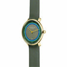 The standout feature is its beautifully green satin-finished dial, accented by vibrant rings of green and blue for a contemporary, artistic touch. Gold-toned hands add warmth and contrast, perfectly complemented by the polished PVD gold-plated 316L stainless steel case.
