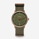 Compact, bold, and crafted with timeless detail — this 38mm automatic watch blends rugged charm with refined mechanics. Housed in a brushed bronze-tone (PVD-coated 316L stainless steel) case, the timepiece features a striking reed green domed dial with a satin finish and Luminova-coated indices, offering both elegance and night-time visibility.