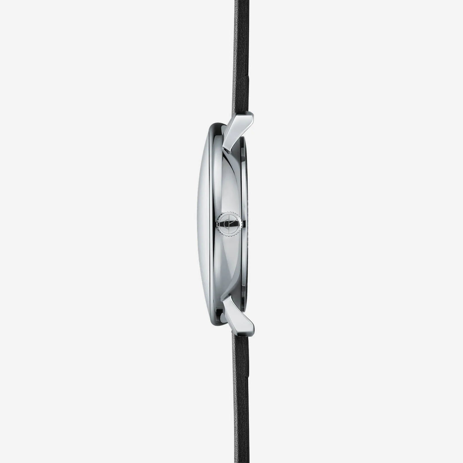 The Sternglas Naos 38mm Quartz Black is a minimalist timepiece that exudes modern elegance and timeless appeal. Featuring a sleek 38mm stainless steel case and a striking black dial, this watch captures the essence of Bauhaus-inspired design with its simple, clean lines. The dial is accented by slim white hour markers and hands, providing excellent legibility while maintaining its refined aesthetic. Powered by a precise quartz movement, this watch offers reliable, low-maintenance timekeeping. Paired with a rich Black leather strap, the Naos Black is the perfect accessory for those who appreciate understated luxury and versatile style.