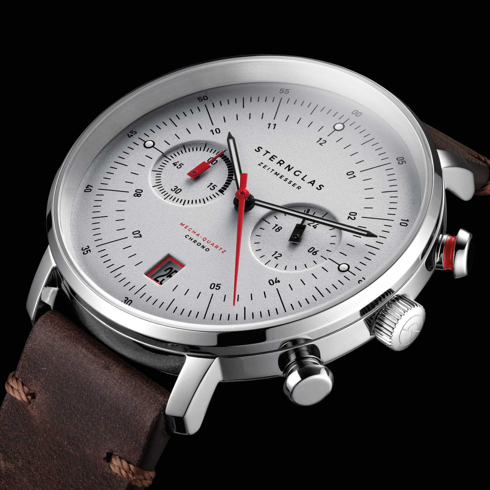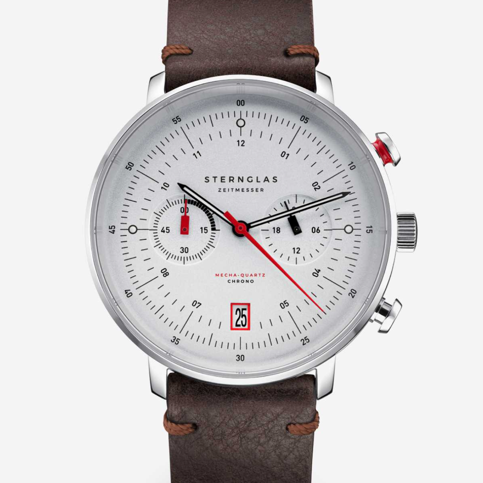 The Hamburg Chrono 42 mm Mecha-Quartz watch combines precision engineering with timeless style. Housed in a 316L stainless steel case with a 42 mm diameter and a slim 9.3 mm profile, this watch is both durable and sophisticated. The curved sapphire glass with double anti-reflective coating ensures scratch resistance and clarity, while the silver dial accented with red adds a sleek, modern touch.