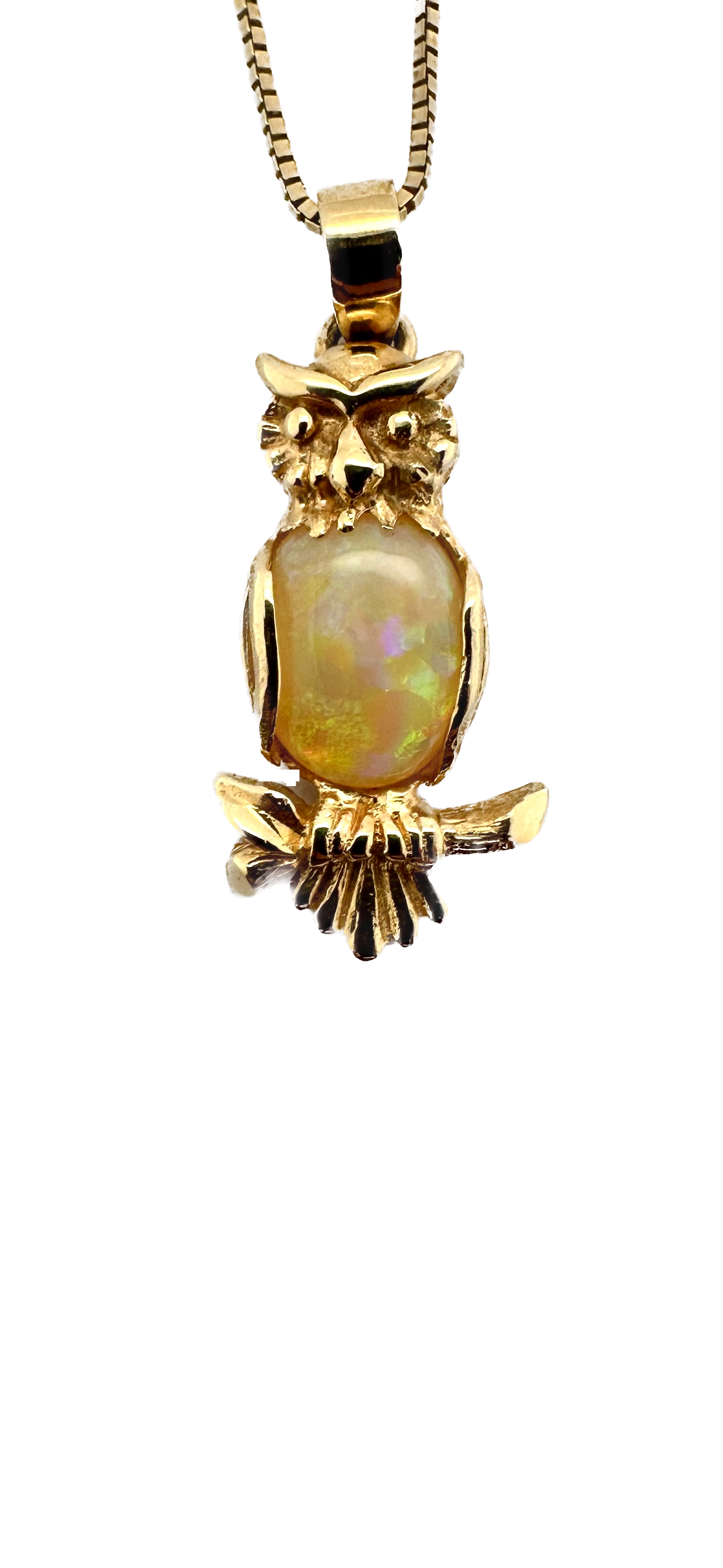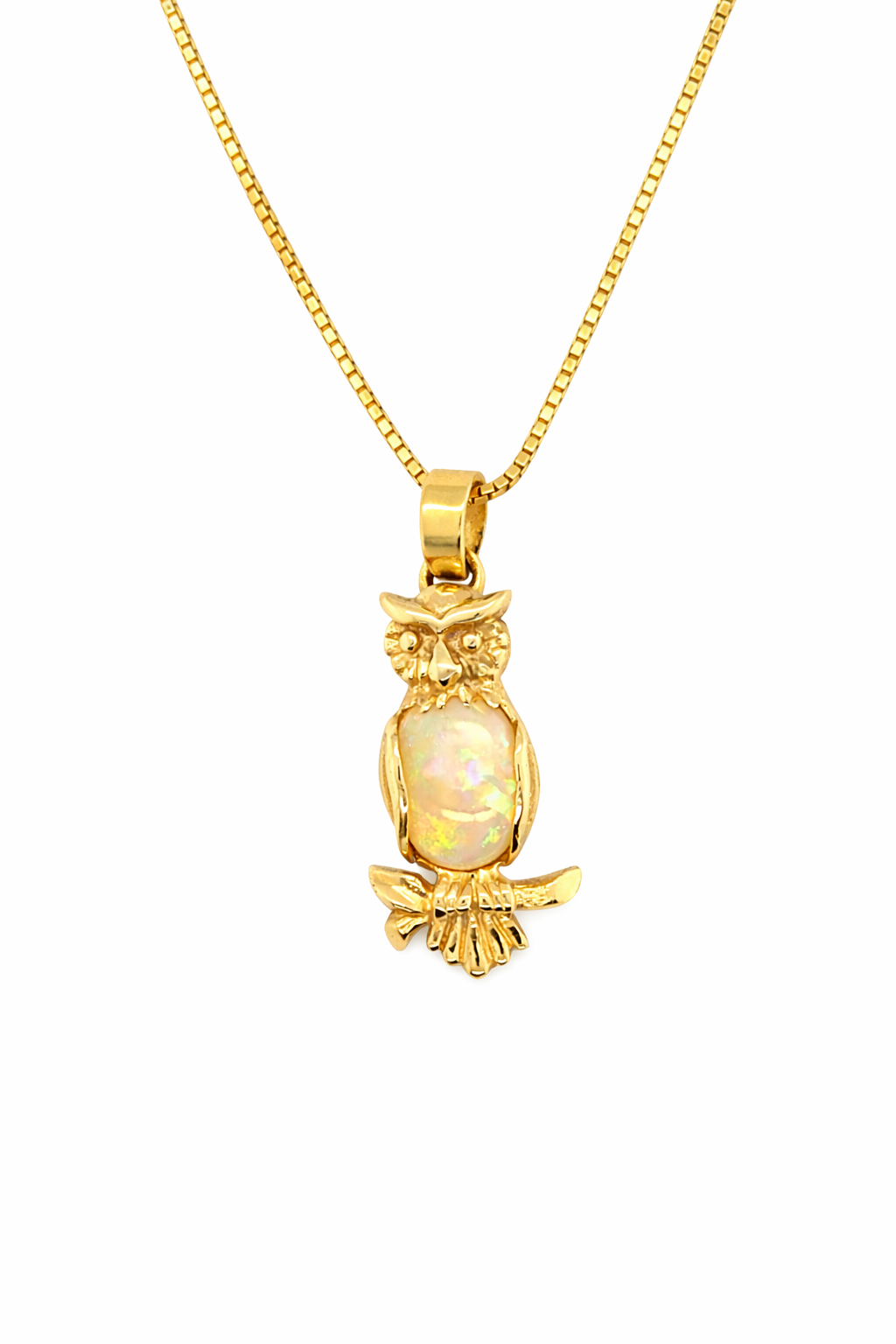 The owl, a timeless symbol of knowledge and protection, is brought to life with exquisite detail. Delicately carved feathers and watchful eyes give this pendant a lifelike charm, all rendered in luxurious 14ct gold. It hangs gracefully from a fine 14ct gold box chain, designed to complement the intricate craftsmanship without overpowering it.