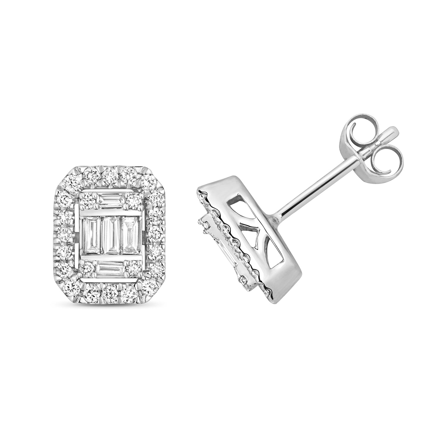 Introducing our stunning pair of 9ct white Gold Diamond cluster studs, a dazzling addition to any jewellery collection. These earrings feature an exquisite blend of brilliant-cut and emerald-cut Diamonds, creating a unique and captivating design. With a total of 58 Diamonds, these studs offer an exceptional sparkle that is sure to turn heads.