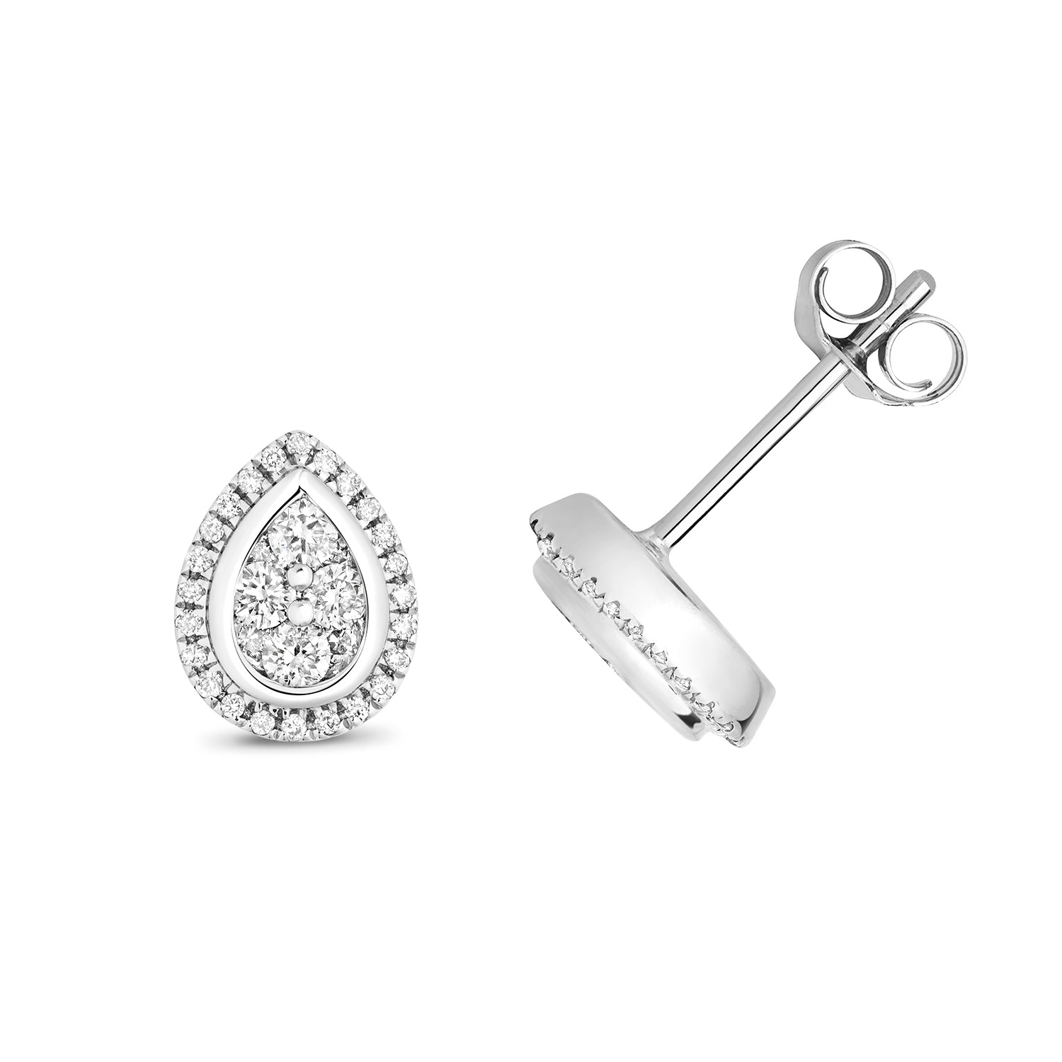 Introducing our stunning pair of 9ct white Gold pear shape Diamond cluster stud earrings, designed to add brilliance to your ensemble. Each earring features a cluster of 64 brilliant-cut Diamonds, boasting H colour and I1 clarity, set in the center with a halo of Diamonds surrounding it. With a total carat weight of 0.25ct, these studs sparkle with elegance. Weighing 1.21 grams, they offer both comfort and style. Finished with heart scroll butterfly closures for a secure and charming touch. Elevate your look with these dazzling pear shape Diamond cluster studs.