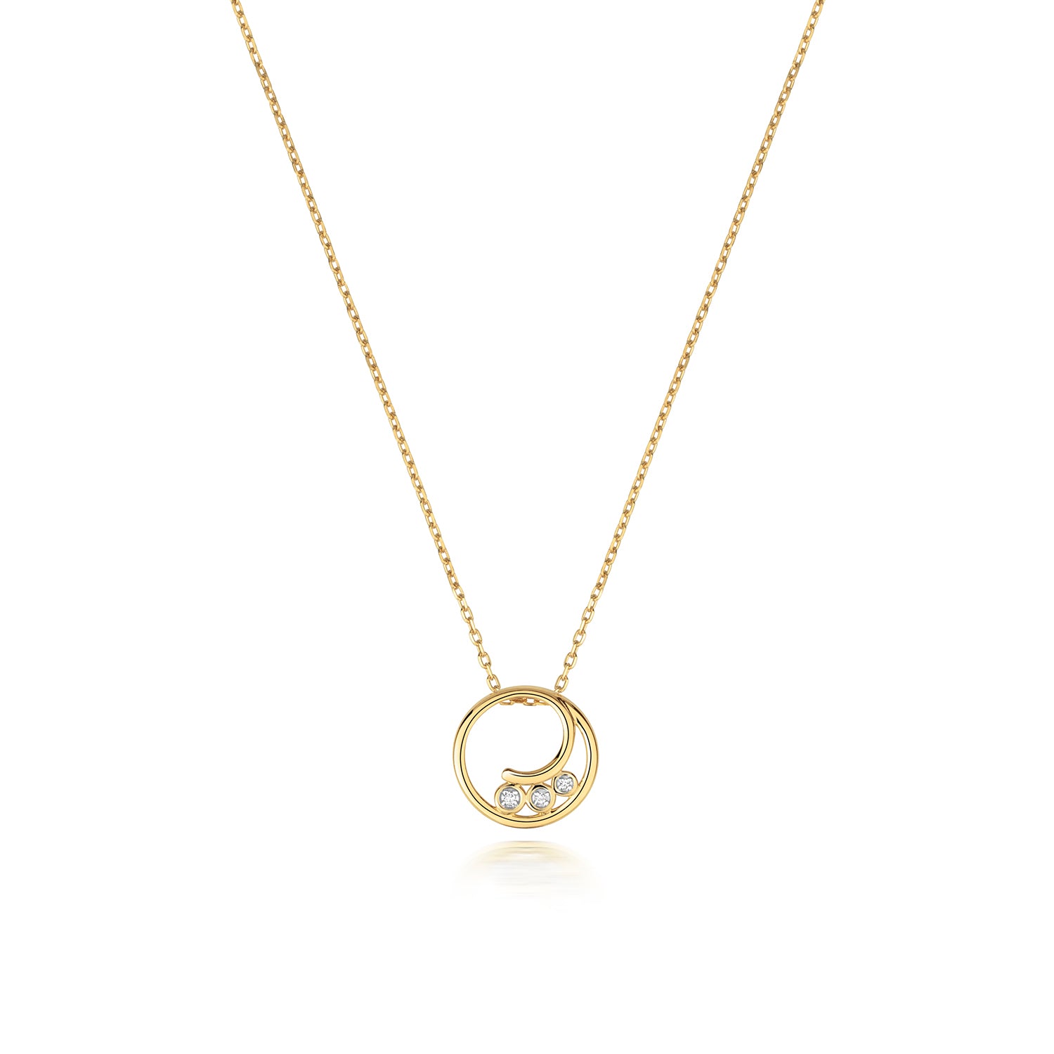 Introducing the captivating 9ct Gold round swirl pendant adorned with a trio of brilliant cut Diamonds, a symbol of refined elegance and sophistication. This pendant features a swirling design accented by three sparkling Diamonds, each securely held in place by a bezel setting to enhance their brilliance. With a total carat weight of 0.01ct and graded H colour, this necklace exudes subtle yet radiant charm.