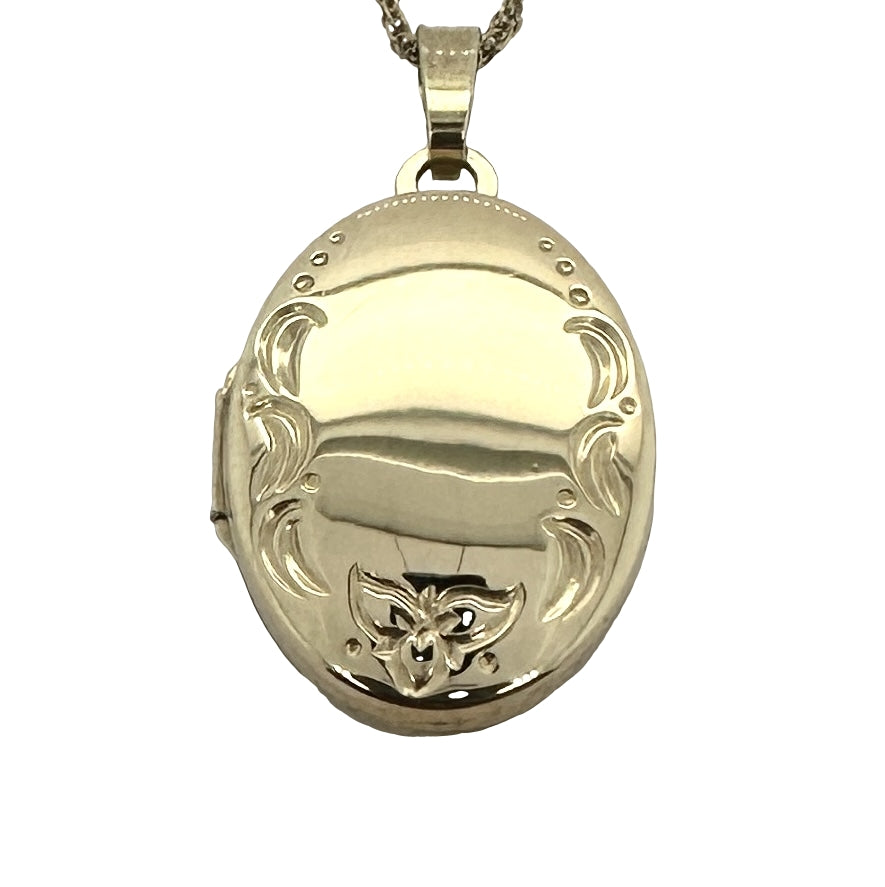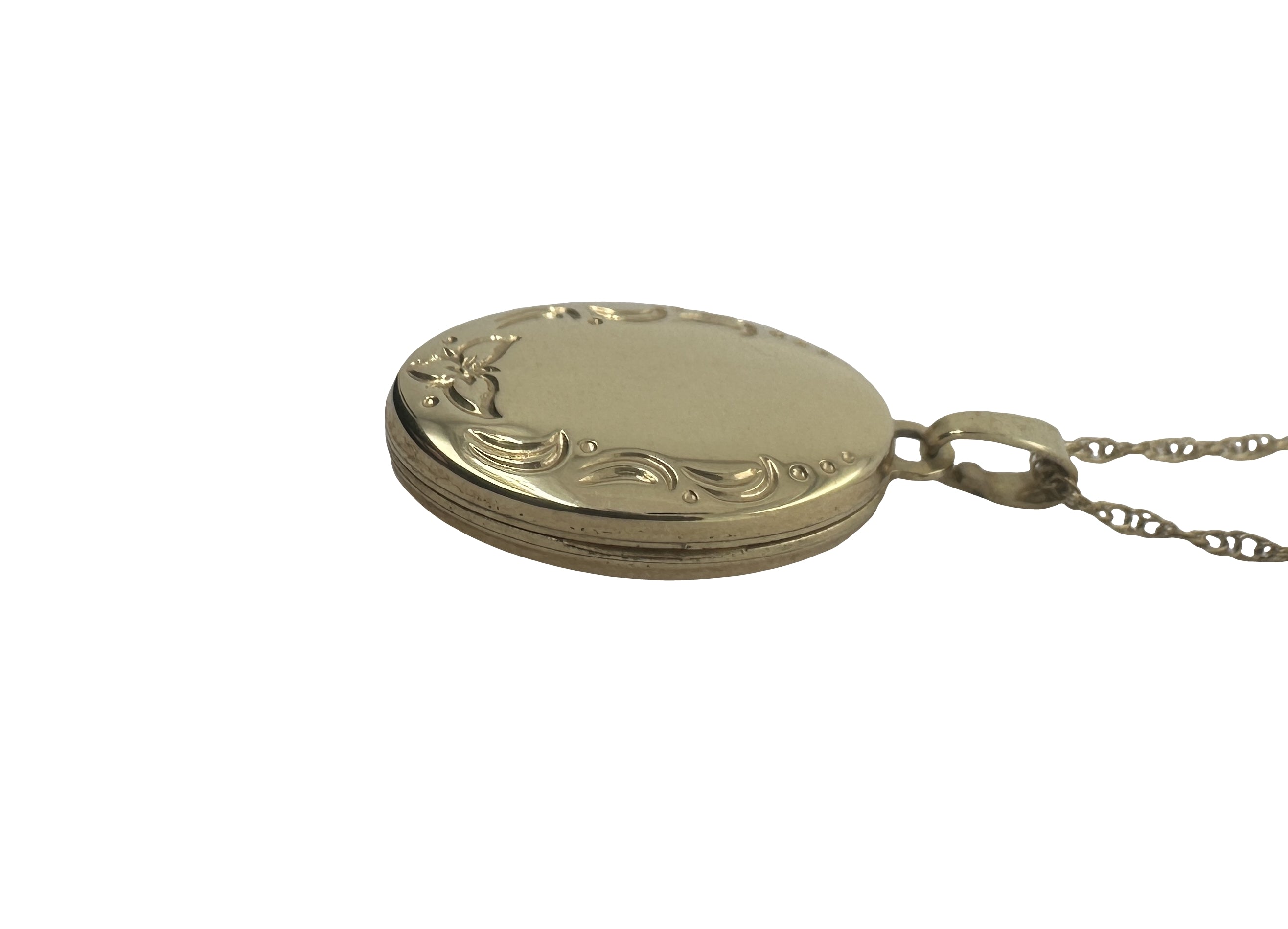 A timeless and elegant 9ct yellow gold oval locket, beautifully crafted with delicate engraved detailing. This classic piece opens to hold treasured memories, making it a meaningful gift or a sentimental addition to your own jewellery collection.