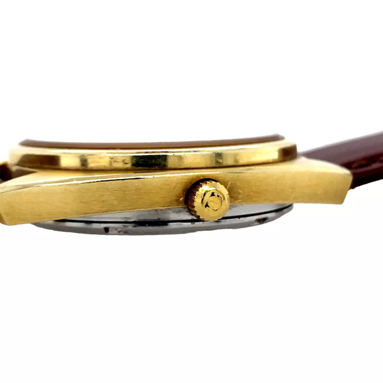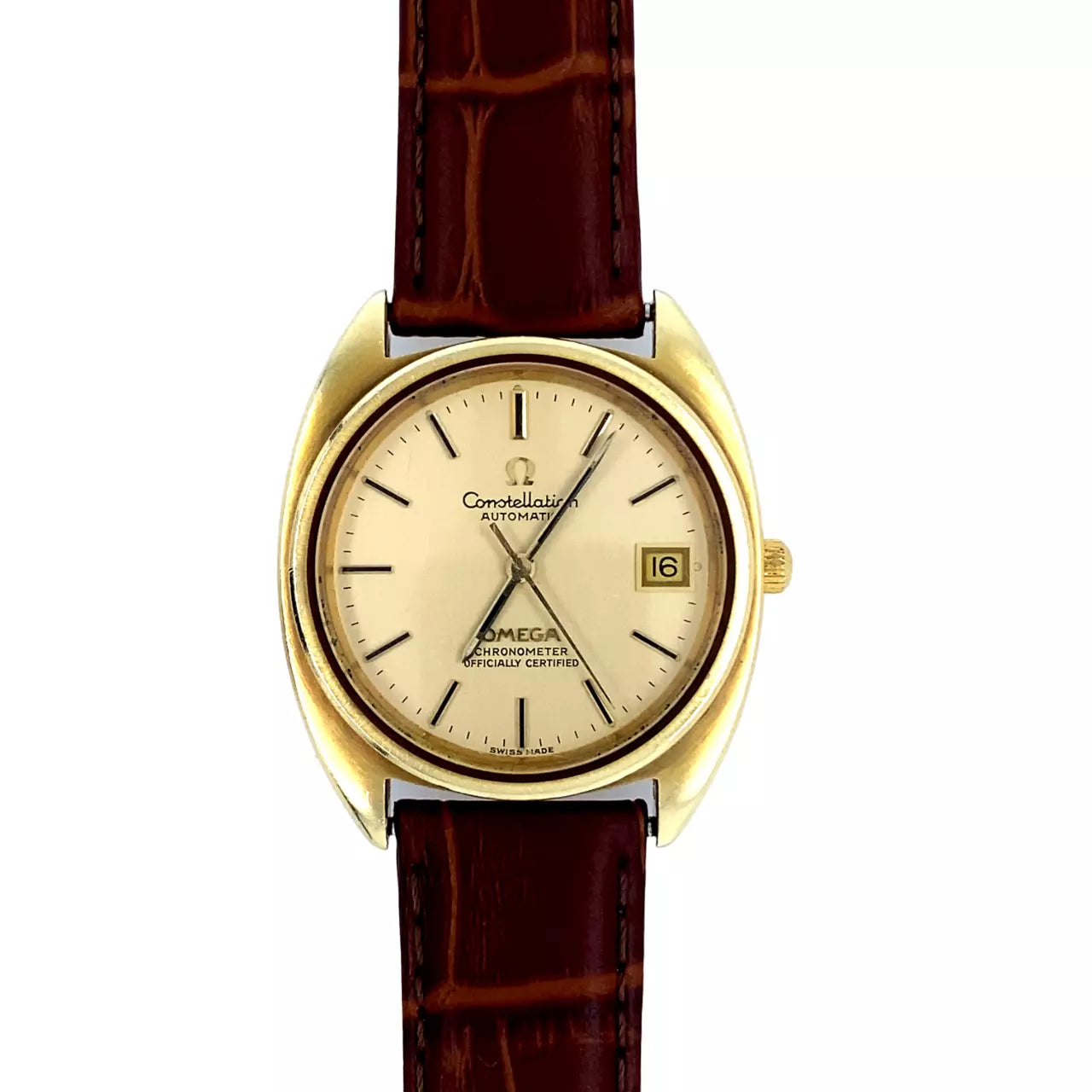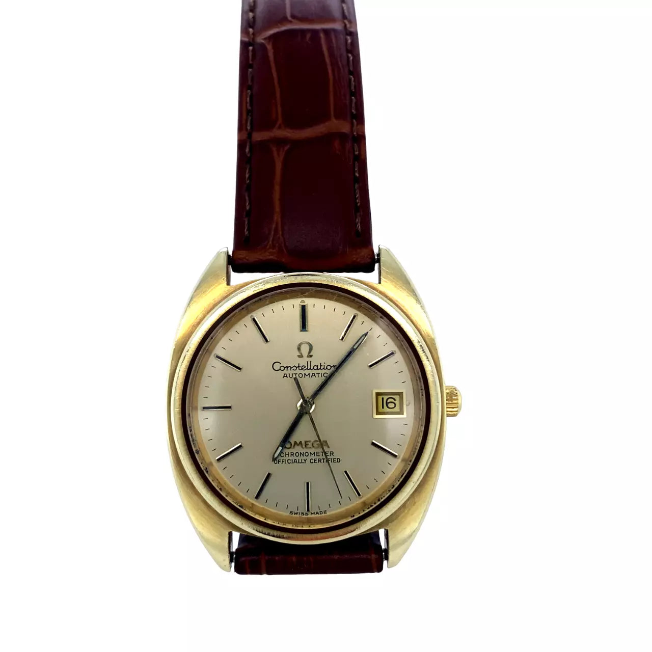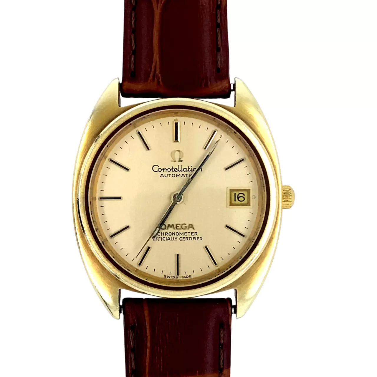 Omega Constellation wristwatch dated 1971. The 35mm Gold plated/Stainless Steel case features a date indicator at the 3 position and raised Gold coloured batons and hands. Original signed Omega crown. It is powered by an automatic (caliber 1011) movement with 23 jewels and 42 hour power reserve. It is attached to a generic 18mm brown leather strap and Omega signed buckle. The serial number dates this watch to 1971. Mechanically running fine. Supplied without box or papers.
