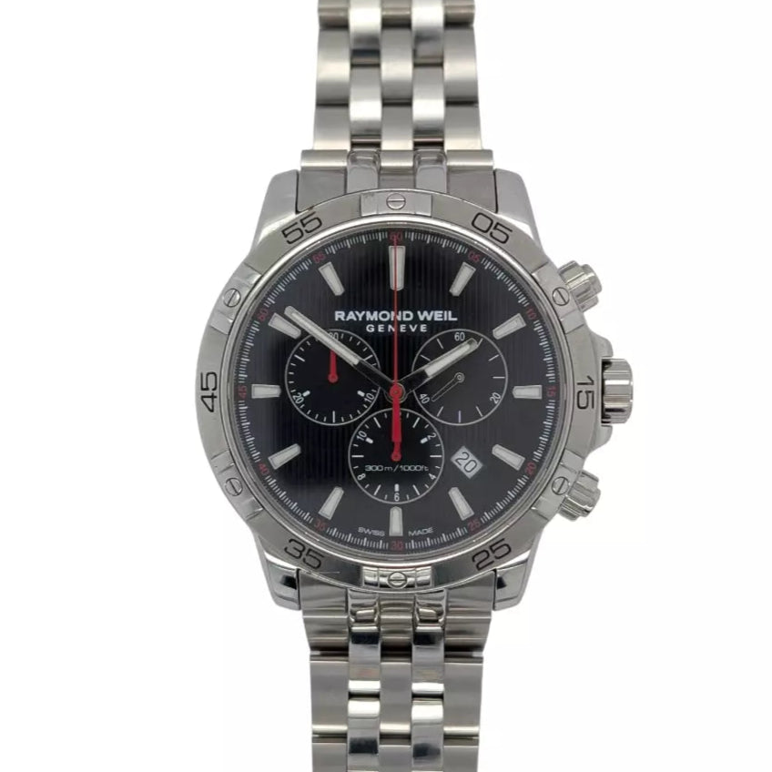 This Raymond Weil Tango Men's Chronograph watch features a sleek silver stainless steel bracelet with a fold-over push-button deployment closure.